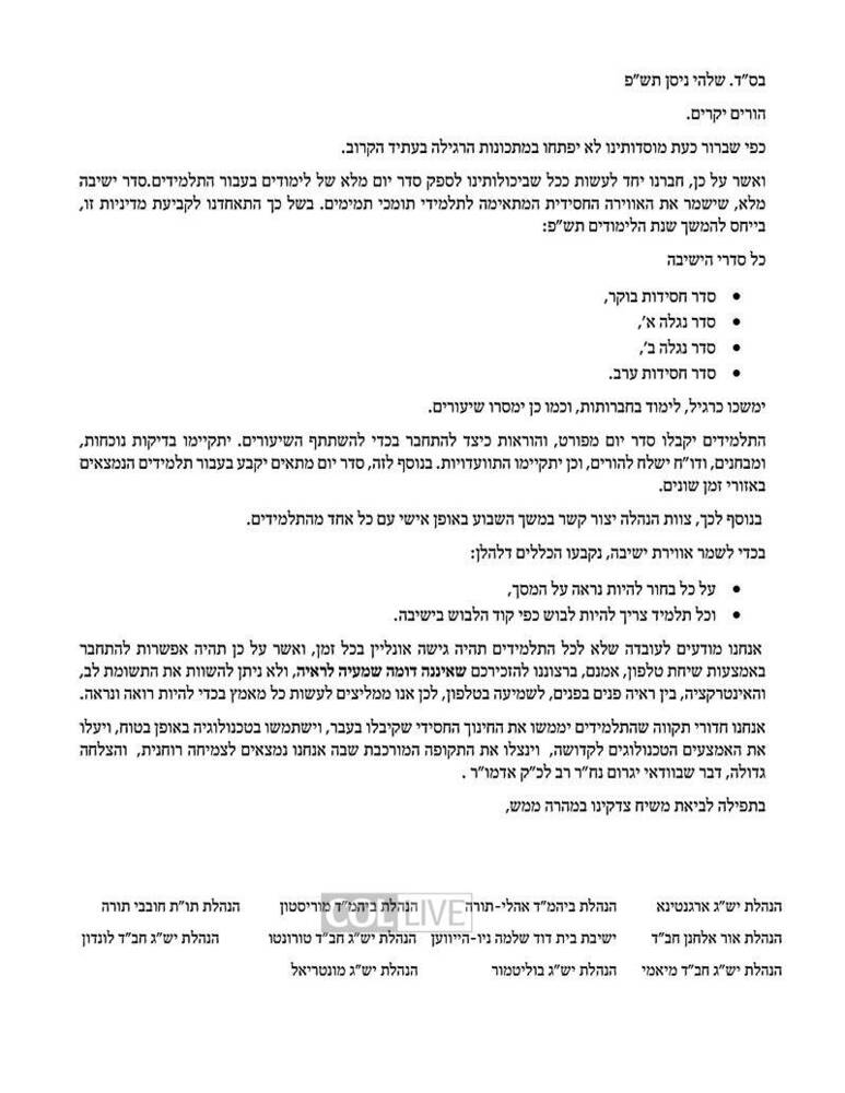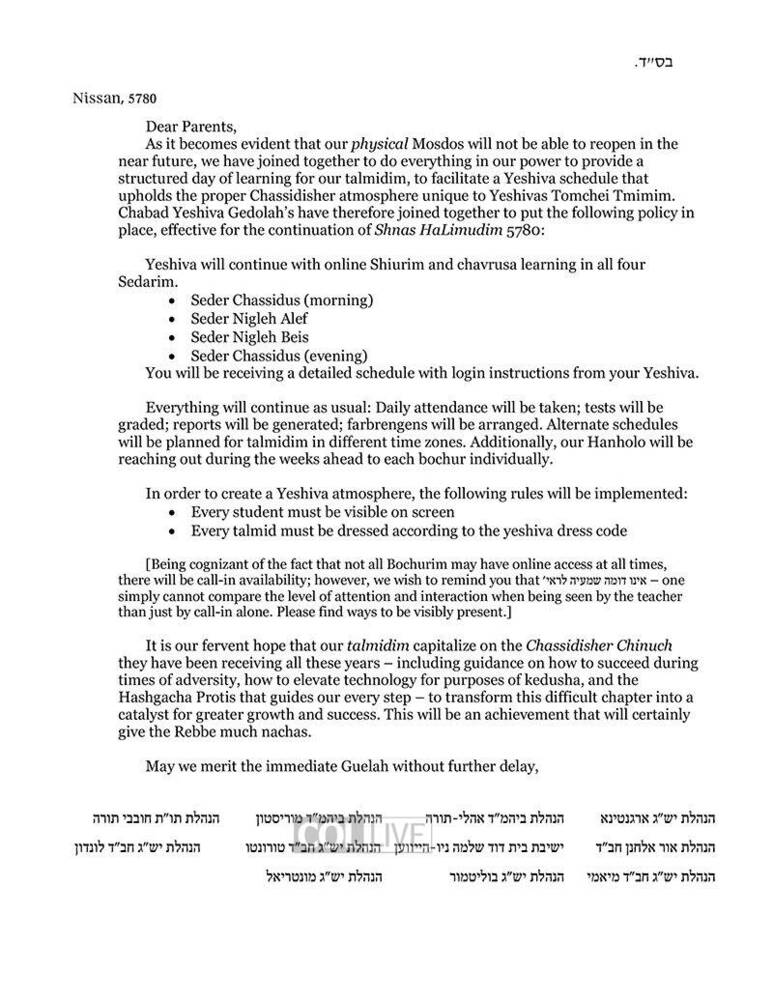 With Pesach break officially over but learning not being able to resume because of the coronavirus, the hanhalas (administrations) of 11 Chabad Yeshiva Gedolahs (zal) sent out a notification to parents and bochurim about a new schedule planned.