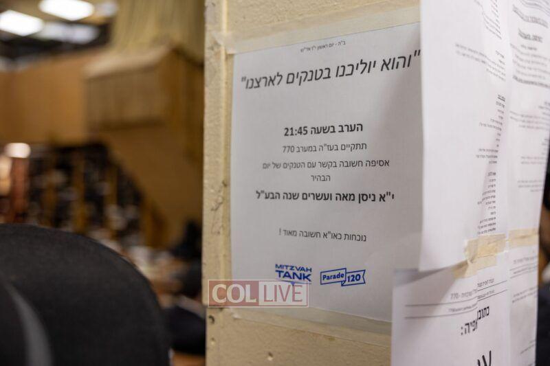 Bochurim gathered for a meeting on Sunday evening to prepare for this year’s Mitzvah Tank Parade of 120 Tanks in honor of Yud Alef Nissan.
