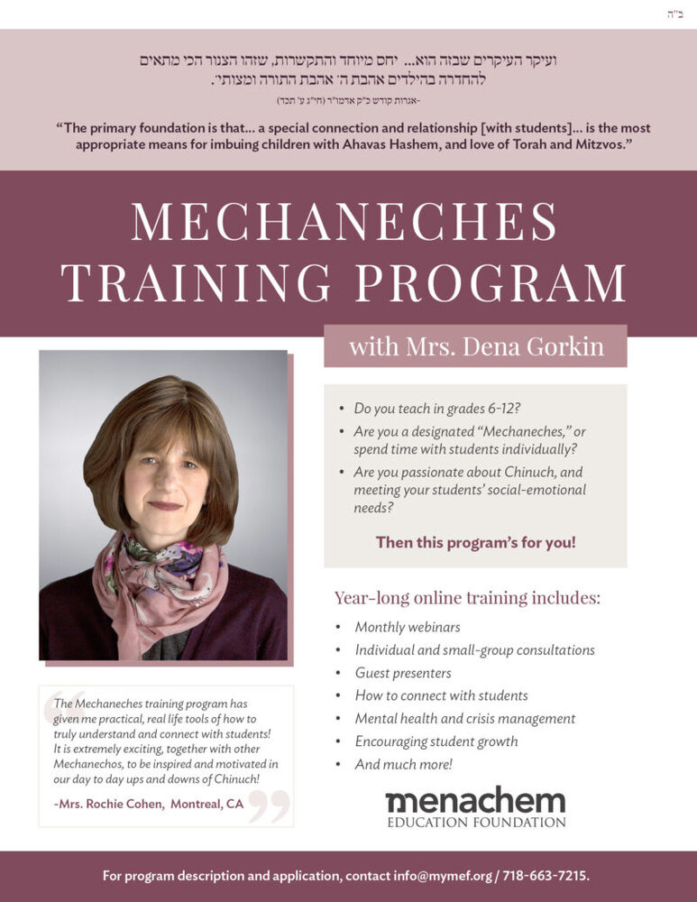 Following the success of year one, the program is now opening registration for Mechanchos for the upcoming school year. “Last year, we had a waiting list of applicants but kept the program small so that each Mechanches could gain optimally,” said Mrs. Chanah Rose, MEF’s educational director. “We’re so excited to get to know a new group of inspired and dedicated Mechanchos in the coming year.”