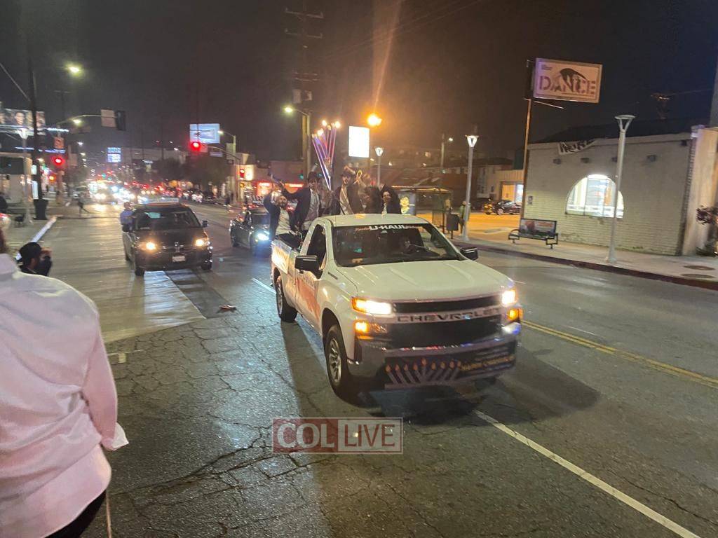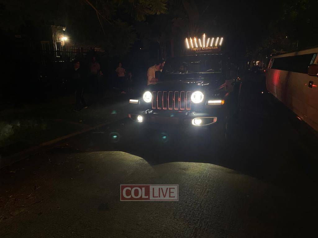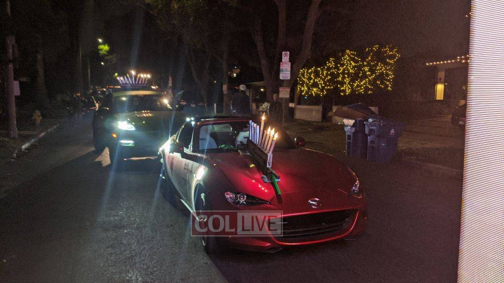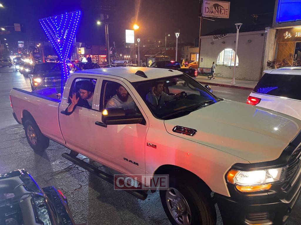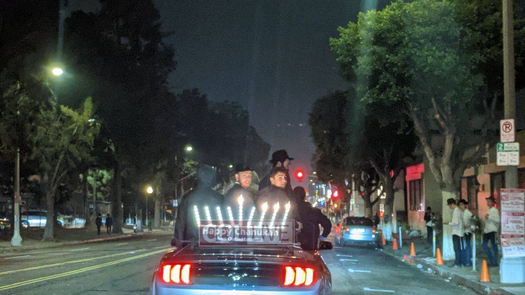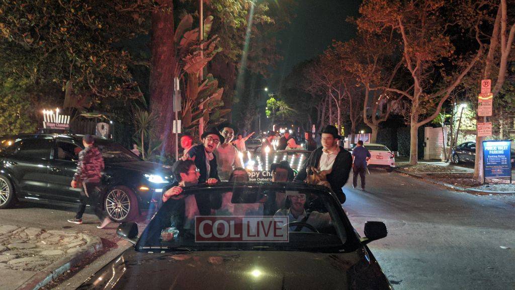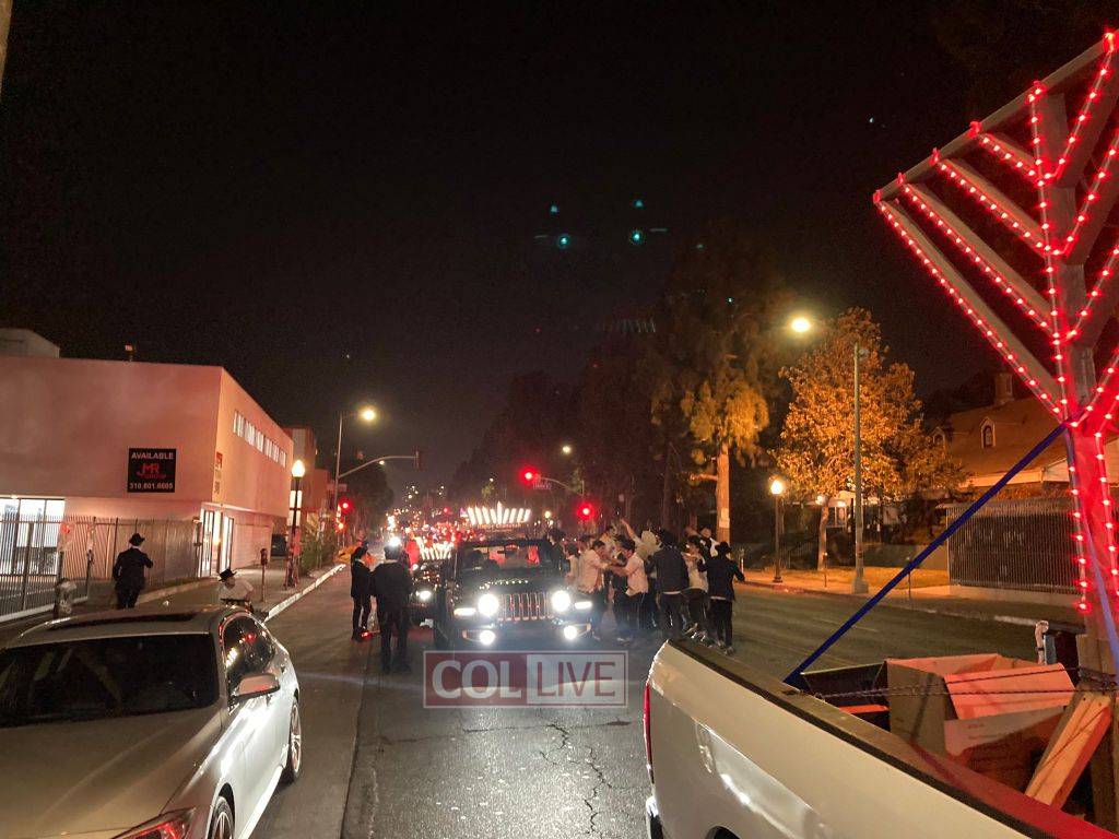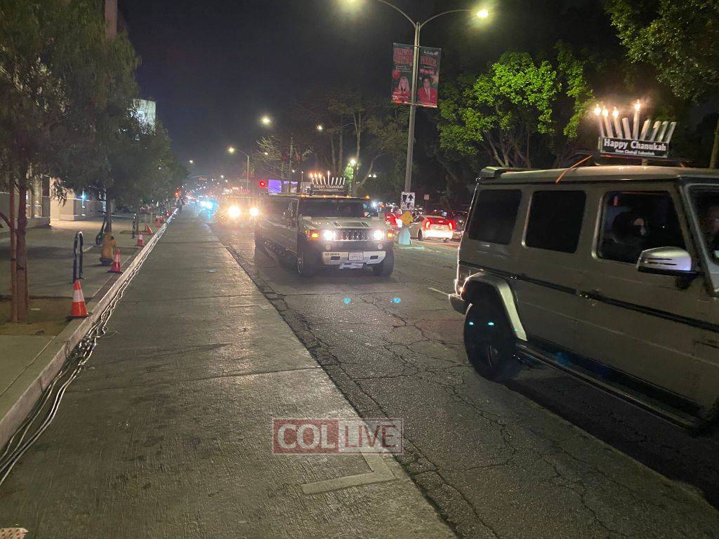 As the menorah-topped cars cruised through the central streets of Melrose, Fairfax, and Beverly, hundreds of people came out from the surrounding stores and restaurants to watch the procession.