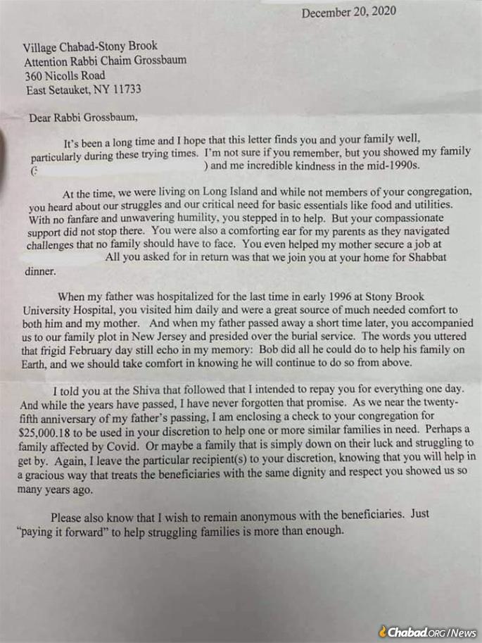 When Rabbi Chaim Grossbaum of Village Chabad-Stony Brook helped a young boy and girl whose parents were down on their luck and facing eviction, he never imagined that 25 years later, it would amount to an anonymous donation in his mailbox in the form of a check for $25,000.18.