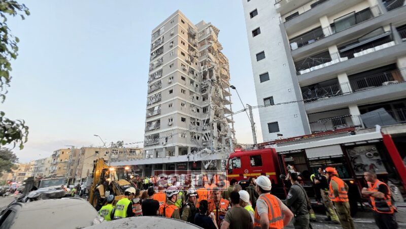 Israeli soldiers of the Home Front Command’s Search and Rescue Brigade continue to operate at the site of an Iranian ballistic missile impact in Bat Yam, the military says.