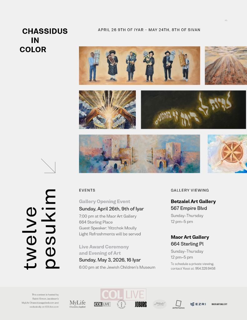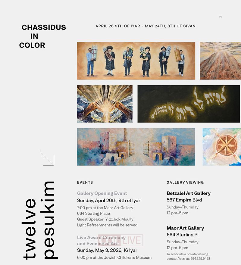 The theme for this year is the 12 Pesukim, challenging artists to explore their inner meaning and bring them to life. Join us for opening night at Maor Art Gallery, 664 Sterling Pl, on April 29th at 7:00 PM. Words will be shared by Yitzchok Moully, with light refreshments served.