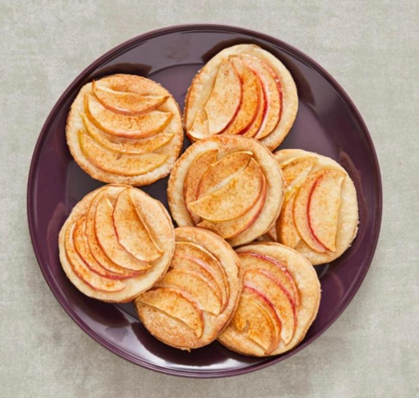 Preheat oven to 400°. Line a cookie sheet with parchment paper and set aside. In a small bowl, combine the Betterine with flour, sugar, salt and wine. Slightly knead to form a crumbly dough. Cover in plastic wrap and refrigerate for 30 minutes. Once the dough has formed, roll it out and make 12 (3-inch) circles about 1⁄8-inch thick and transfer to the cookie sheet. If the dough gets too soft, place in a small bowl and refrigerate for a few minutes before proceeding. Place circles on the prepared baking sheet. Sprinkle each circle with some sugar. Place a few apple slices on top of each dough circle. Combine remaining sugar and cin- namon and sprinkle over apples. Bake for 20 minutes until light brown.