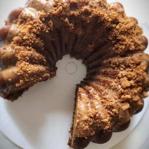Preheat oven to 325 degrees and spray a bundt pan ( always make sure you look at the size of the bundt pan ( this is a 10 c capacity) which was the perfect size for the cake and remember to GREASE your bundt! I use bakers joy or pam for baking. *Bake at 325 degrees for approx 45-50 mins or until cake tester/ skewer comes out clean. The top of the cake should look firm and not be jiggly. *Cool for 5 mins and invert onto a cooling rack( remove your cake when its still hot. Sounds crazy but it works! Wear oven mitts!)