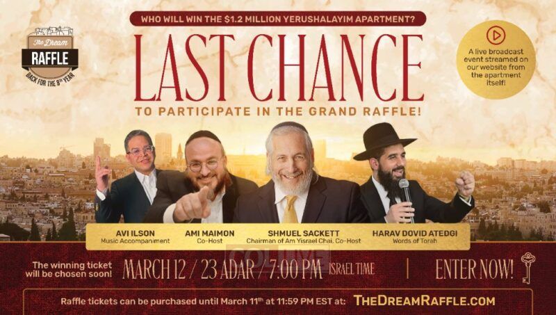 Maaser money may be used. Drawing will be livestreamed on the raffle website, Thursday, March 12, 7pm Israel time.