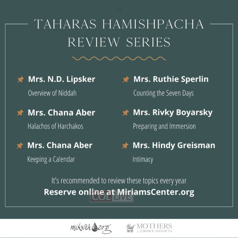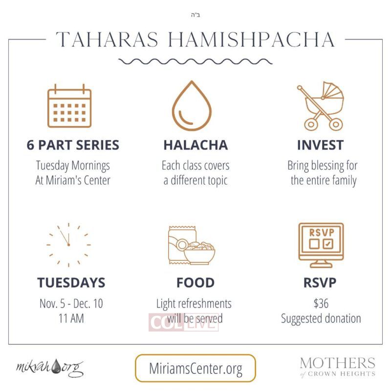 Classes will take place from Daled Cheshvan, November 5th through Tes Kislev, December 10th on Tuesday mornings at 11 AM. The sessions will cover different aspects of Halachah, focusing on the practical and spiritual parts of family purity.