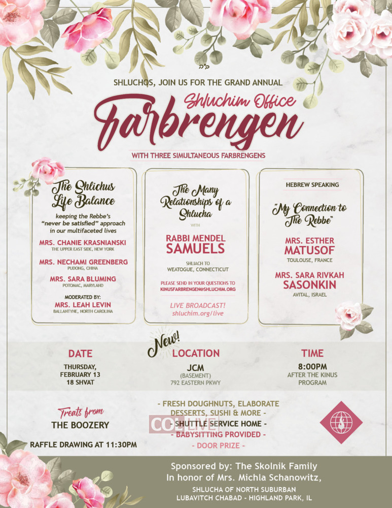 Join us Thursday night, 18th of Shevat (February 13th) at 8 PM, after the Kinus Hashluchos events conclude for 3 simultaneous Farbrengens, with incredible and inspirational speakers and topics! Elaborate desserts including freshly made doughnuts and treats from the Boozery will be served. A raffle will be held featuring vouchers to Tzfasman Jewelers, Kettle & Cord and Totally Her, among other great prizes.