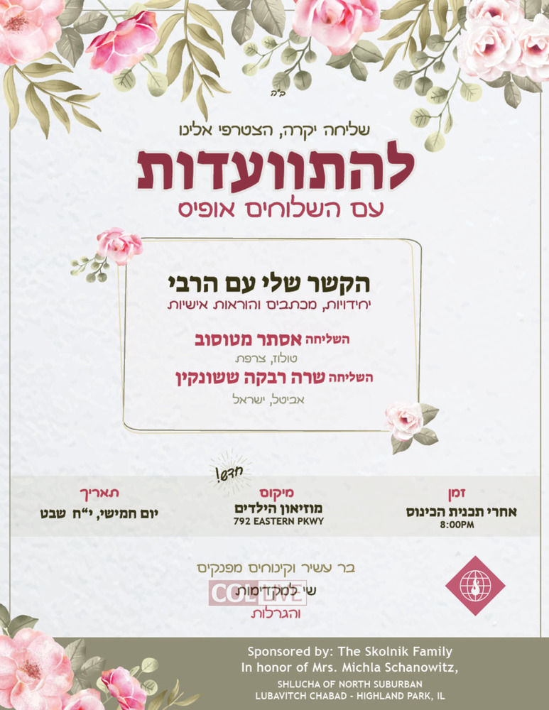 Don’t forget: join us on Sunday night, the 21st of Shevat (February 16th) after the Kinus Hashluchos banquet for a second Farbrengen at The Shluchim Office, Hebrew Farbrengen will be on the 4th floor.