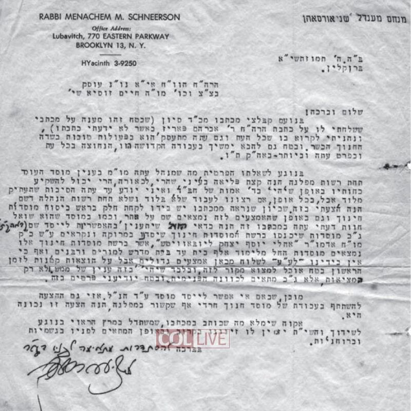 “It would be advisable for you to explore the possibilities of also establishing institutions there (in the Holy Land) that would join the network of educational institutions…called “Oholei Yosef Yitzchak Lubavitch” after the [Frierdiker] Rebbe, my father-in-law,” the Rebbe wrote to the famed Chabad activist Reb Zushe Wilmovsky, in a letter dated 5 Tammuz, 5711, exactly 74 years ago.