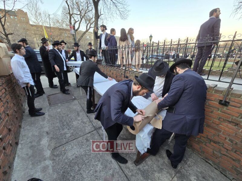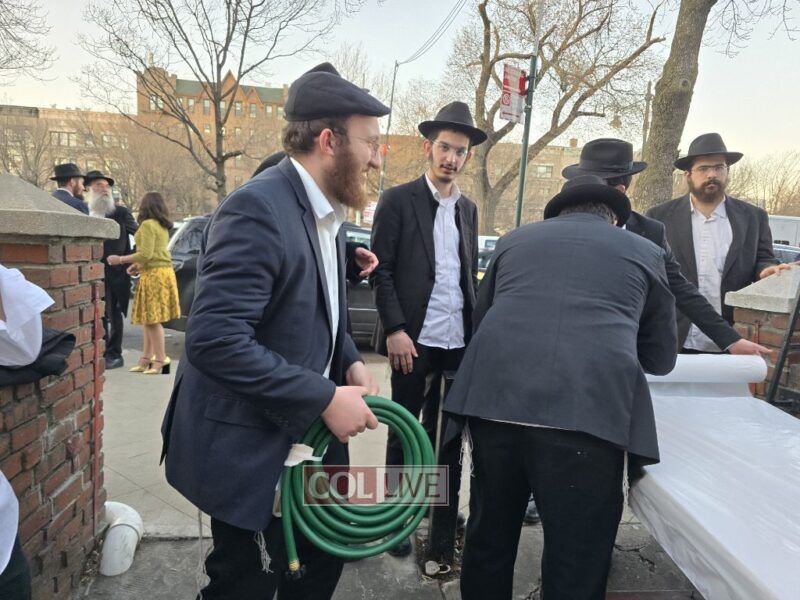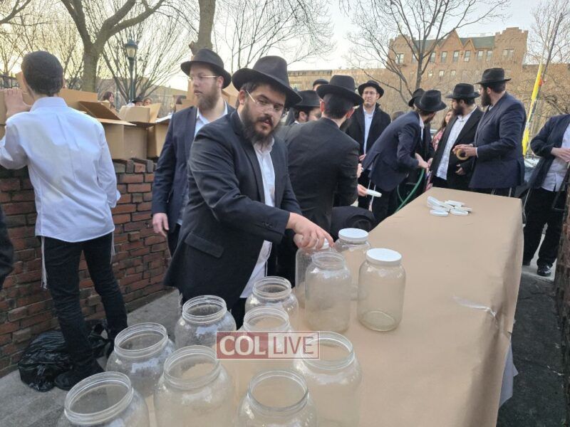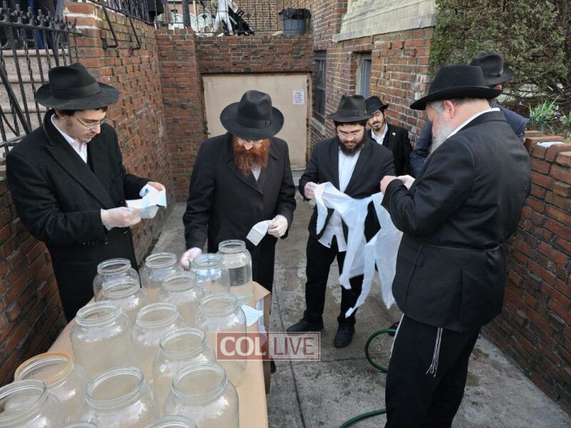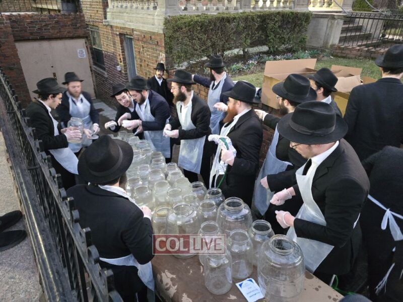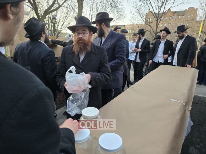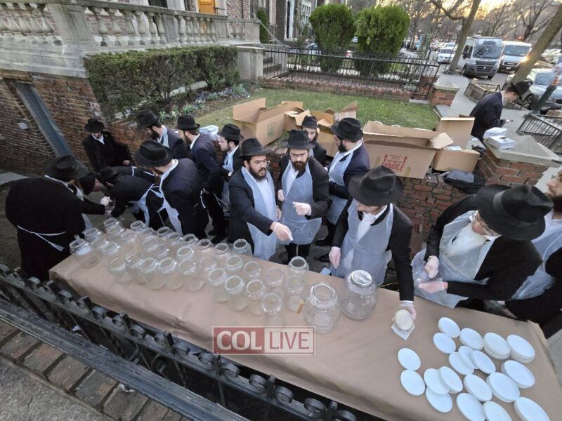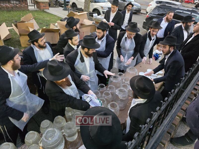 Yeshiva bochurim stood outside 770 Eastern Parkway together with their Mashpia Rabbi Kuti Feldman and prepared 'mayim shelanu,' the water that will be used for the baking of shmura matzos for their Pesach Seder next month. Photos