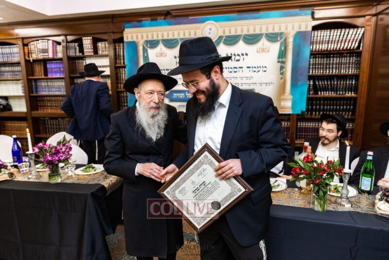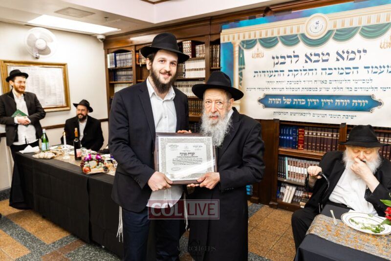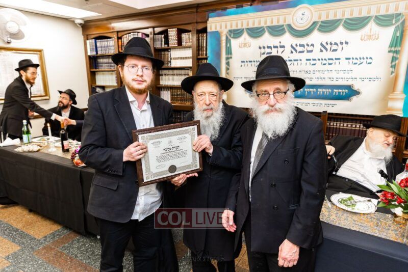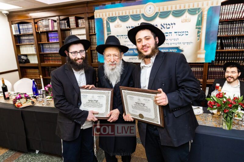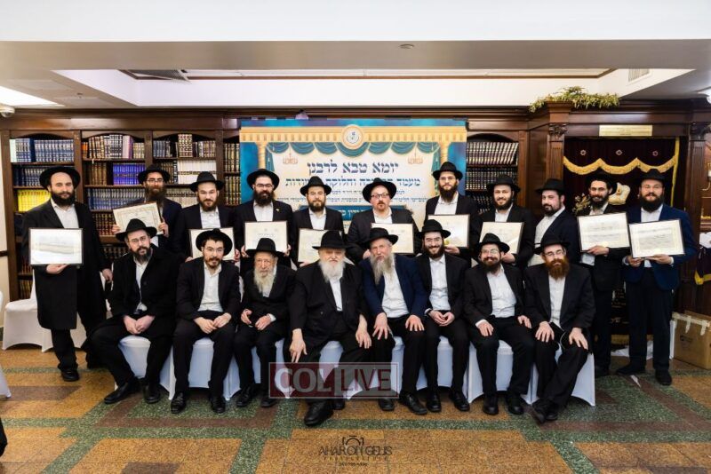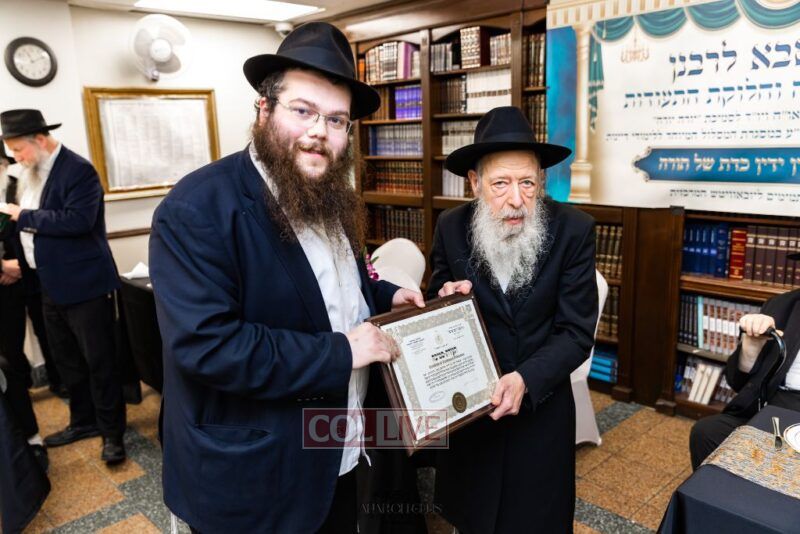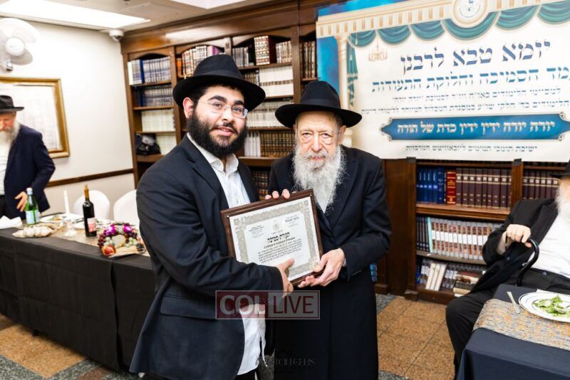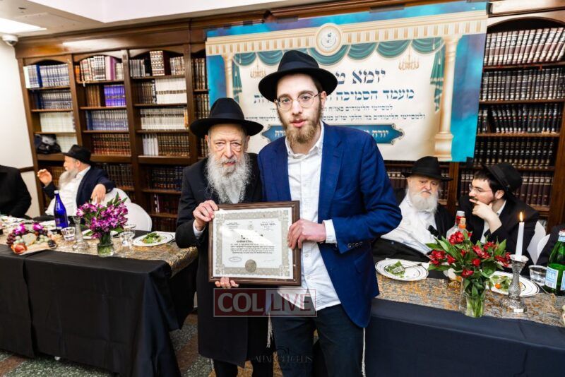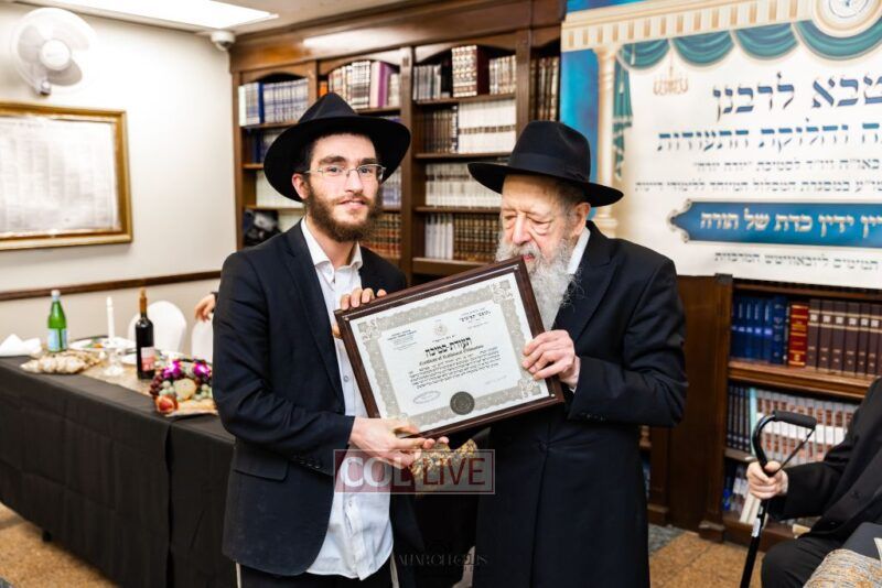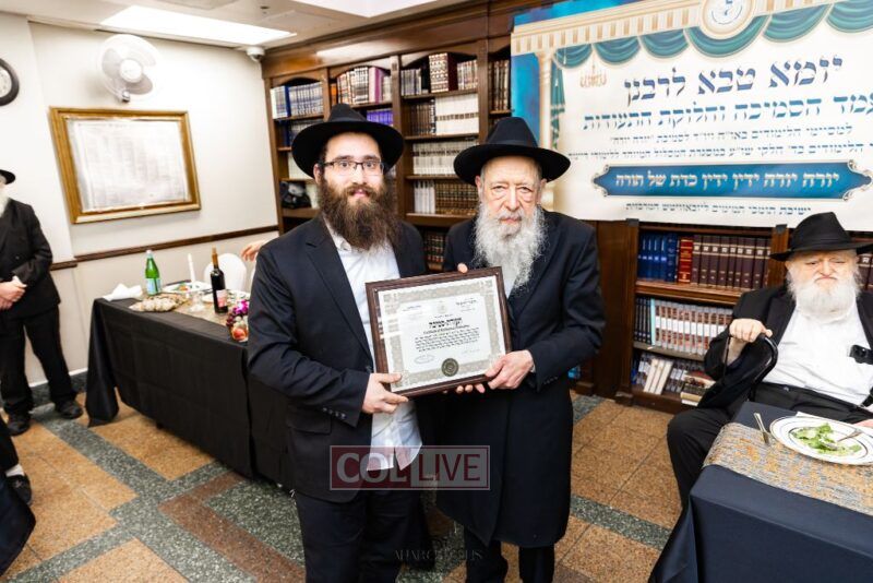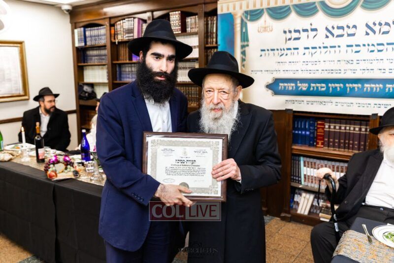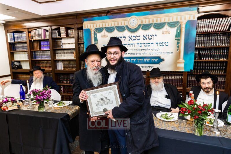 Before the certificates were distributed, Rabbi Avi Eskinazi, on behalf of the mesaimim of the Dayanus program, presented Rabbi Labkowski and Rabbi Liberow with a set of seforim with the names of those who chipped in for it as a token of appreciation for their dedication to the success and growth of all the talmidim. Rabbi Labkowski was also presented with an acrylic photo of him beside the Rebbe at “mayim shelanu”.