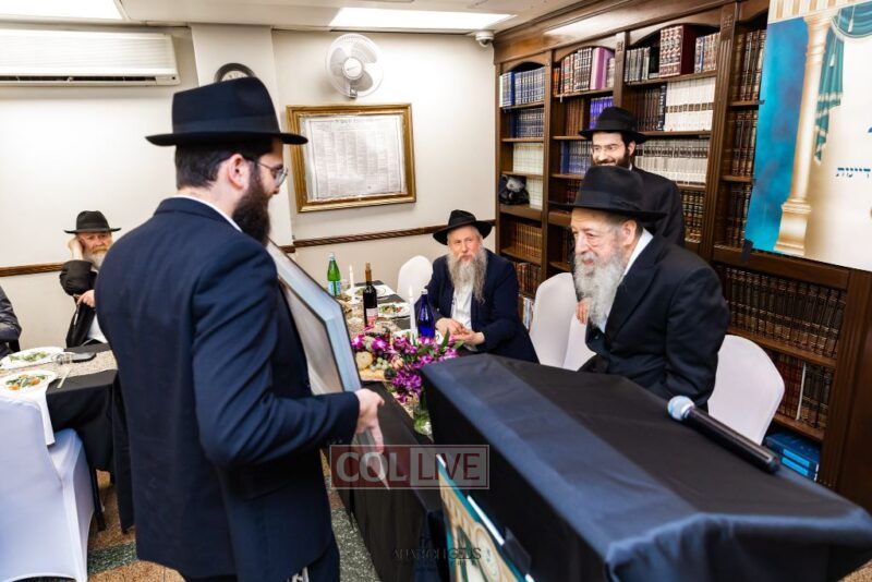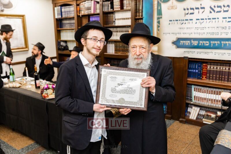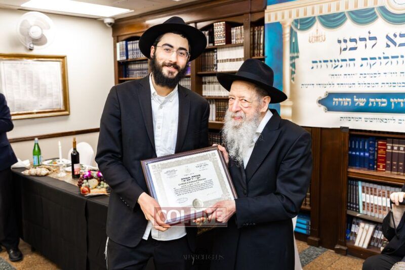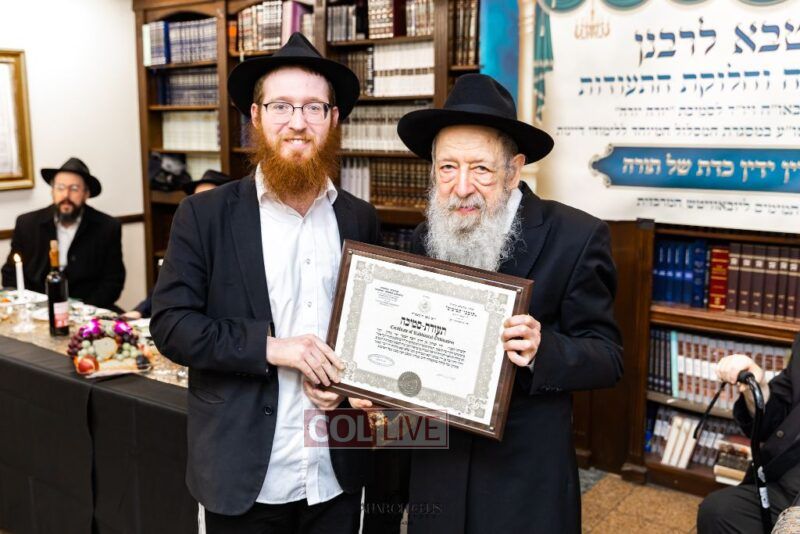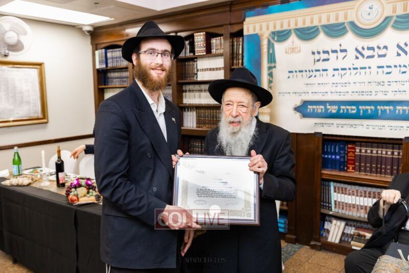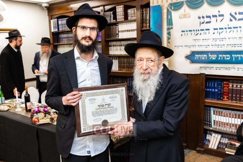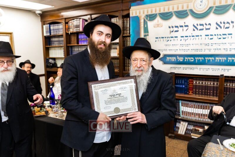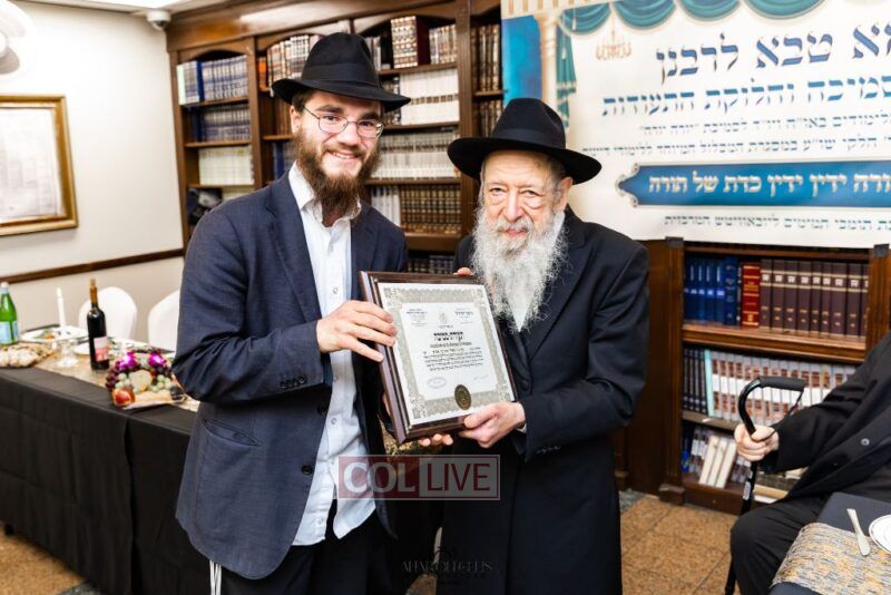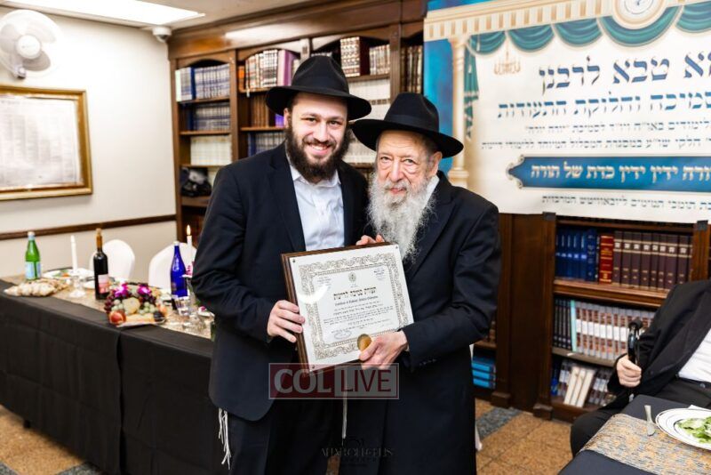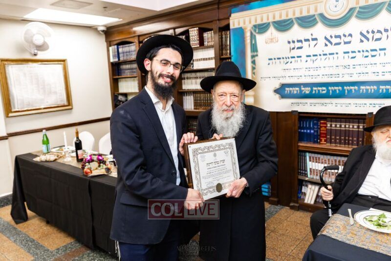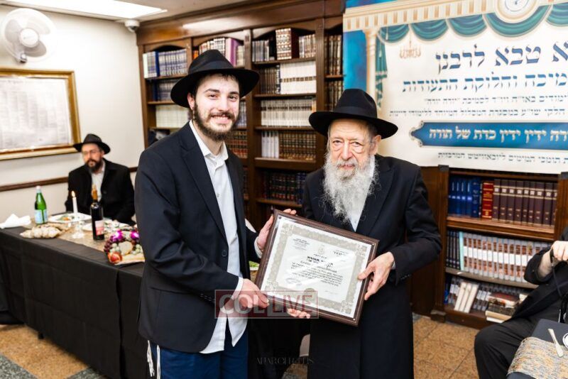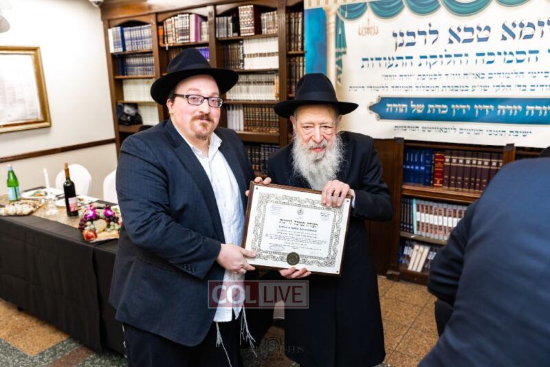 Before the certificates were distributed, Rabbi Avi Eskinazi, on behalf of the mesaimim of the Dayanus program, presented Rabbi Labkowski and Rabbi Liberow with a set of seforim with the names of those who chipped in for it as a token of appreciation for their dedication to the success and growth of all the talmidim. Rabbi Labkowski was also presented with an acrylic photo of him beside the Rebbe at “mayim shelanu”.