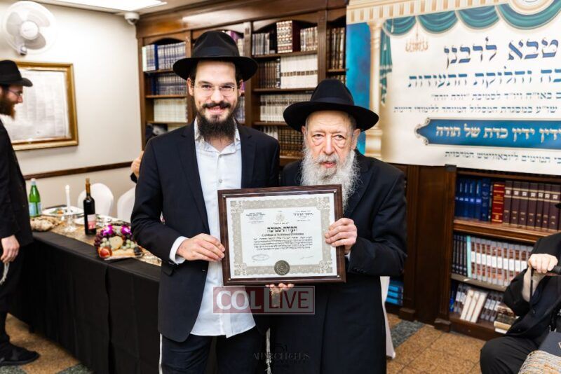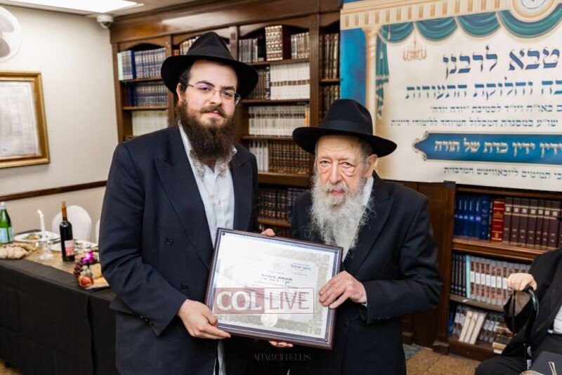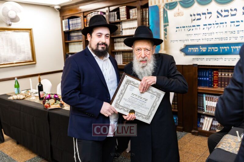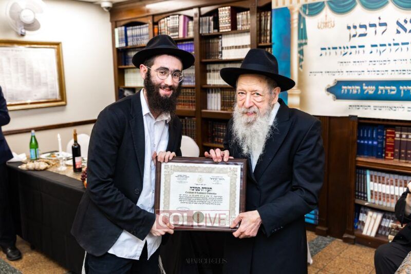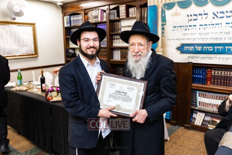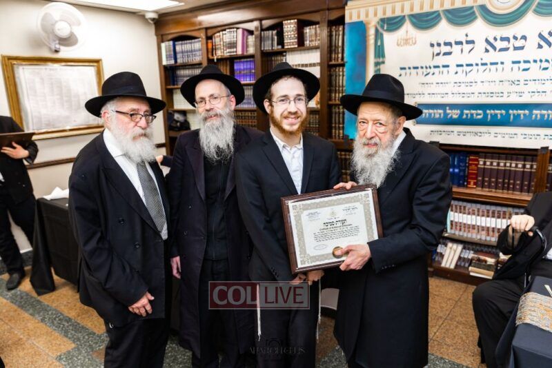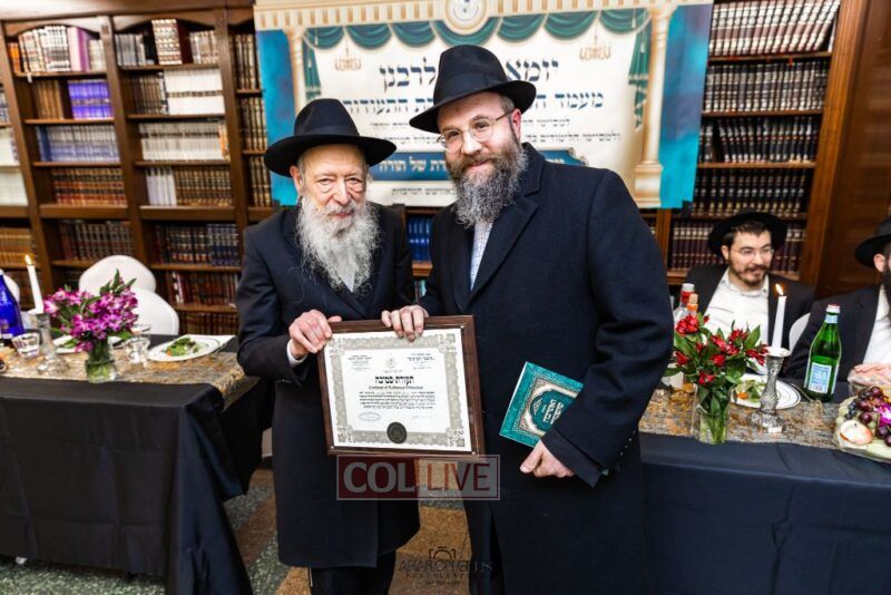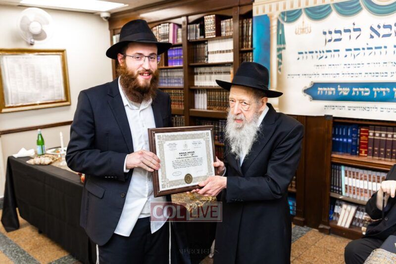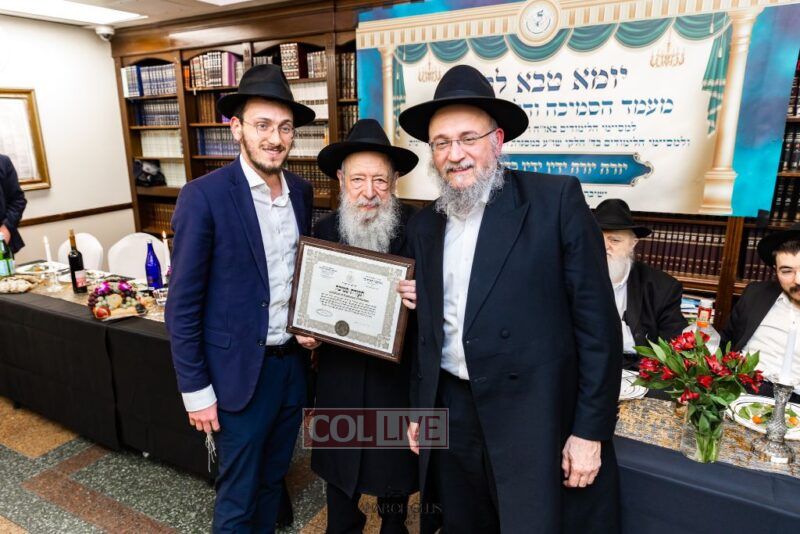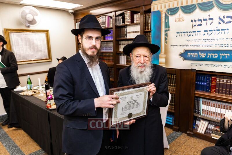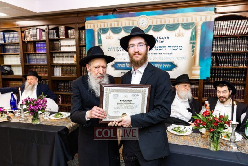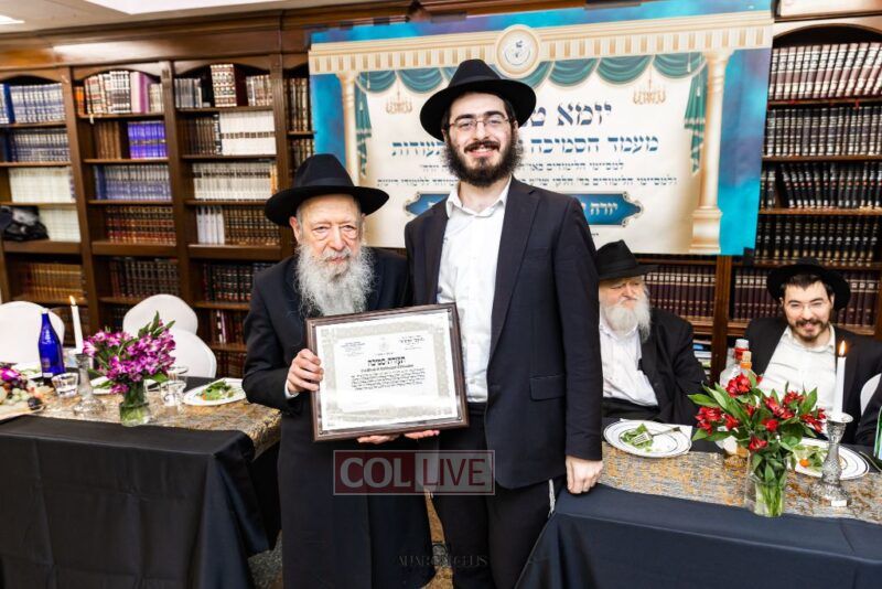 Before the certificates were distributed, Rabbi Avi Eskinazi, on behalf of the mesaimim of the Dayanus program, presented Rabbi Labkowski and Rabbi Liberow with a set of seforim with the names of those who chipped in for it as a token of appreciation for their dedication to the success and growth of all the talmidim. Rabbi Labkowski was also presented with an acrylic photo of him beside the Rebbe at “mayim shelanu”.