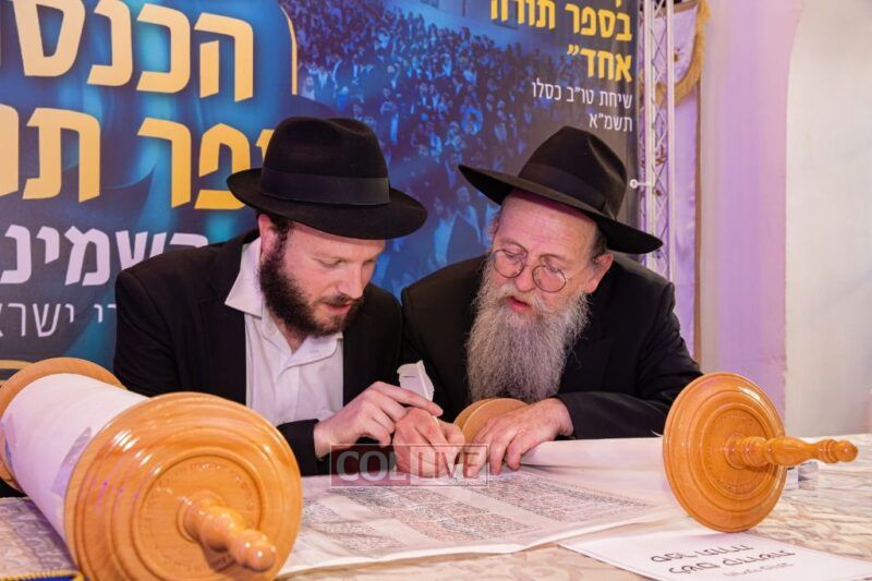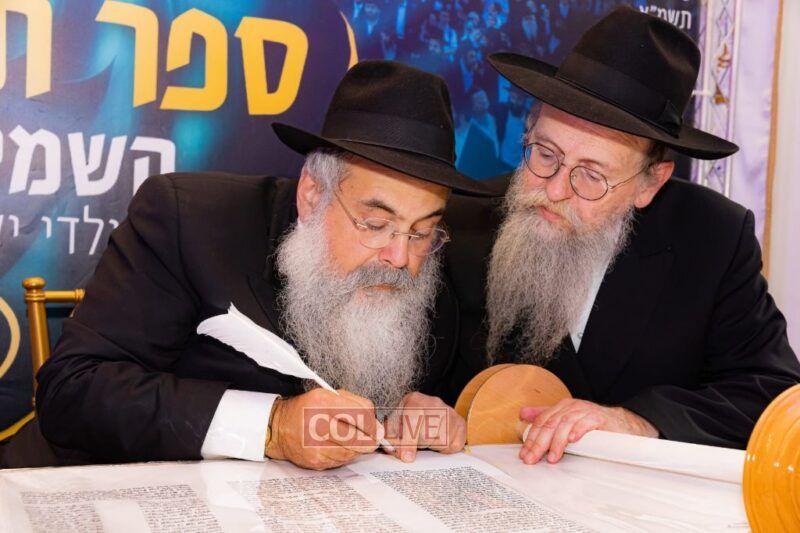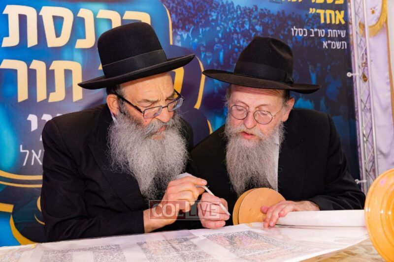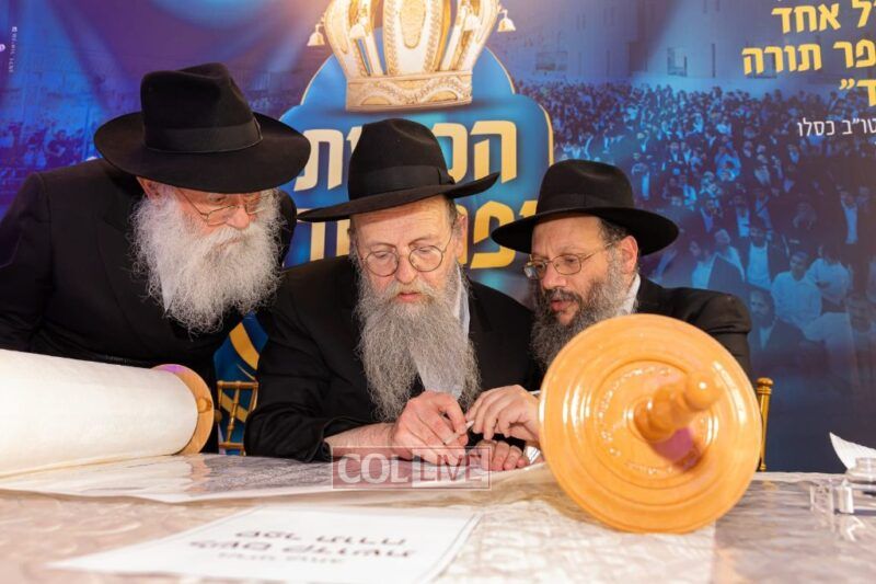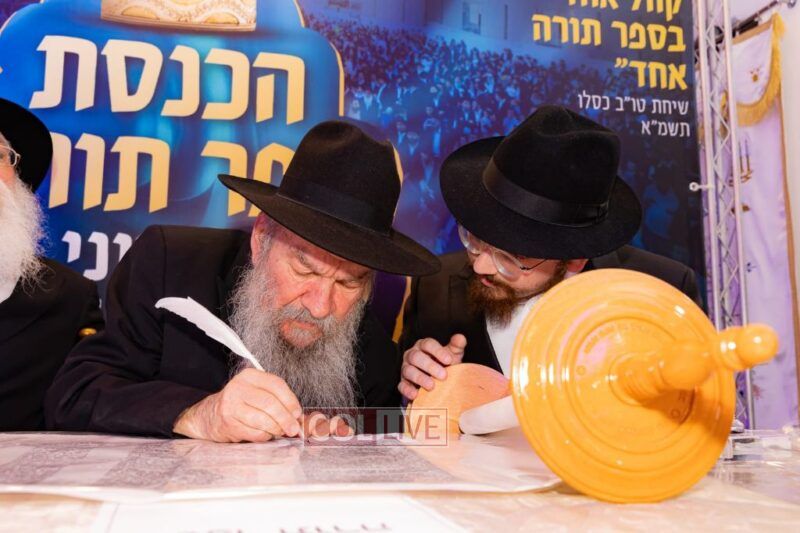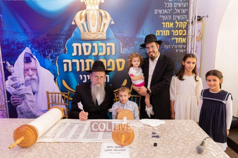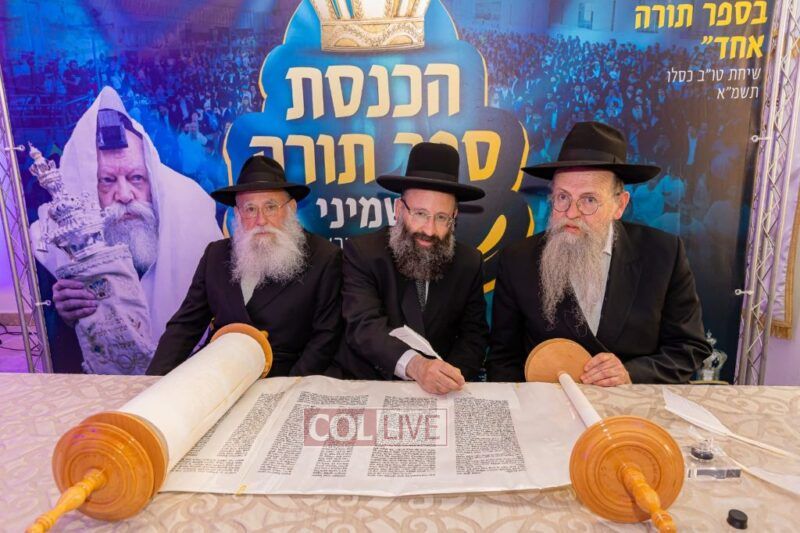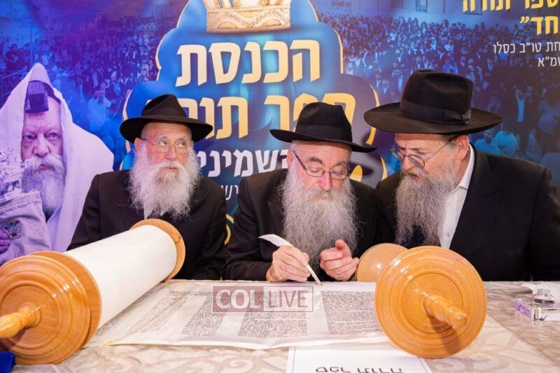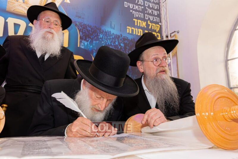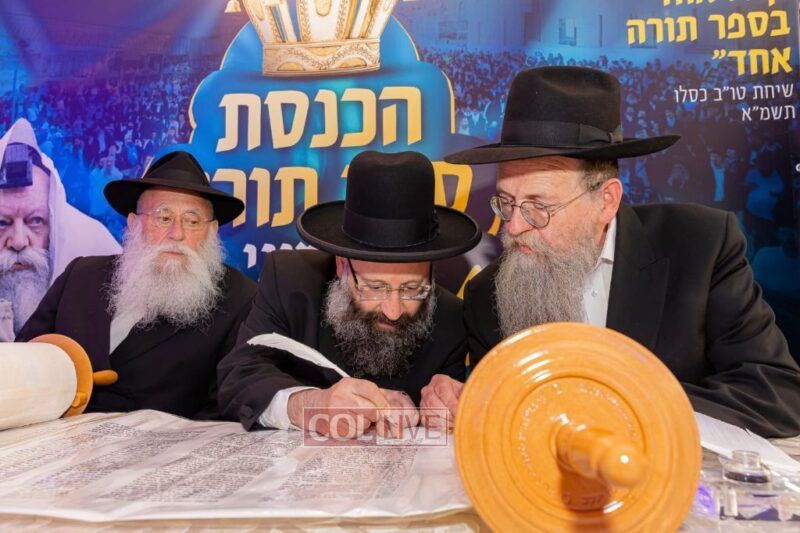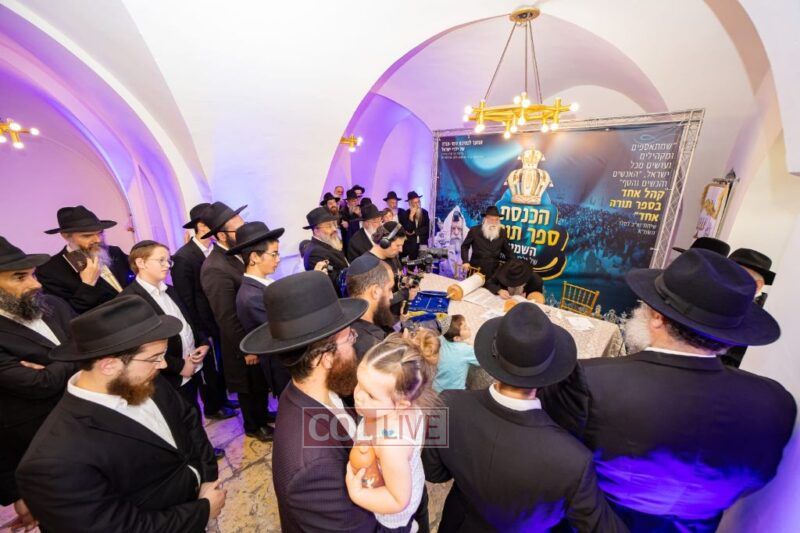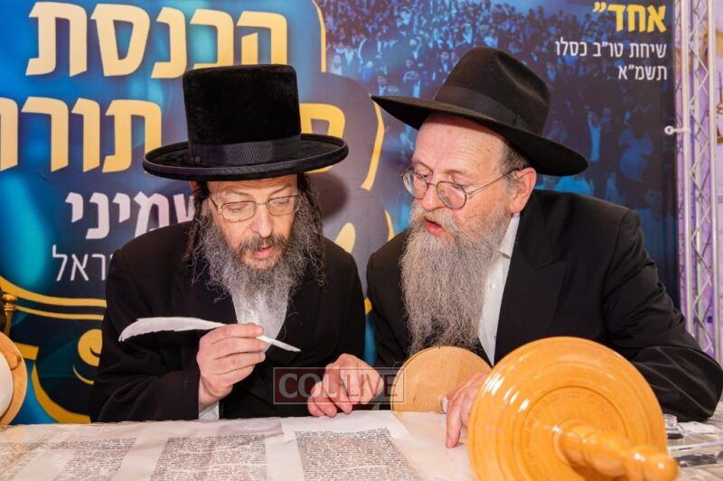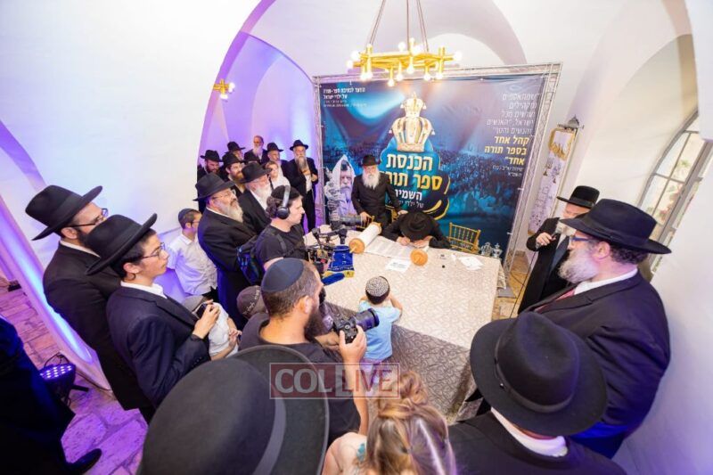 Today, the eighth Torah scroll was completed in the same place, during this Hakhel year. Thousands gathered at the Western Wall in Jerusalem to celebrate its completion, with the participation of prominent Rabbis and Shluchim.