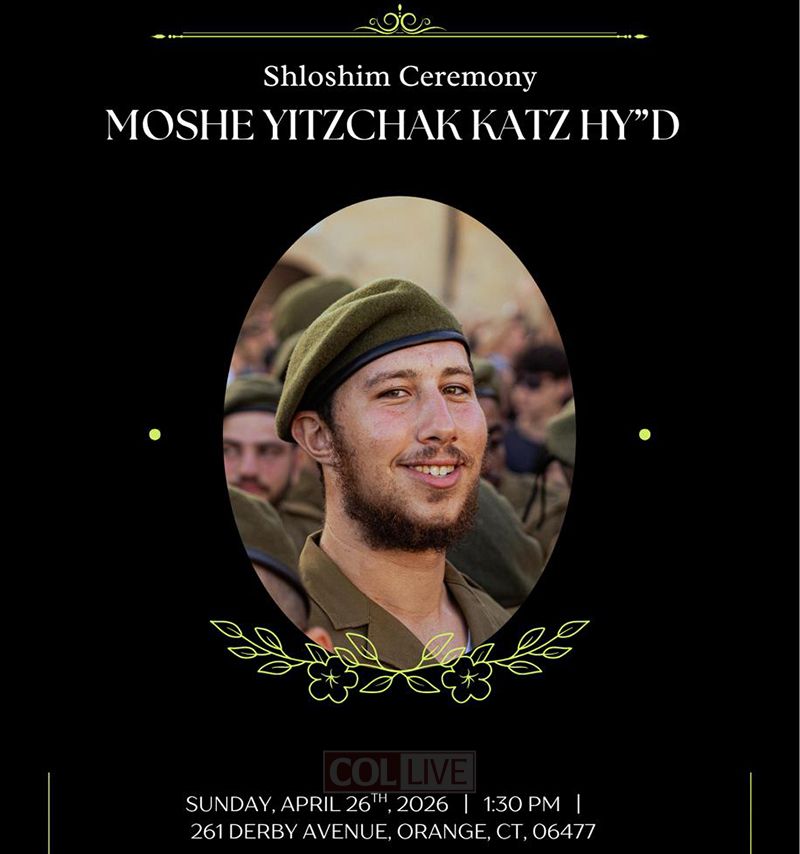 An event marking the Shloshim - 30 days since the passing of Moshe Yitzchak Katz HY”D will take place on Sunday, April 26, 2026, at 1:30 PM in Orange, Connecticut. Full Story
