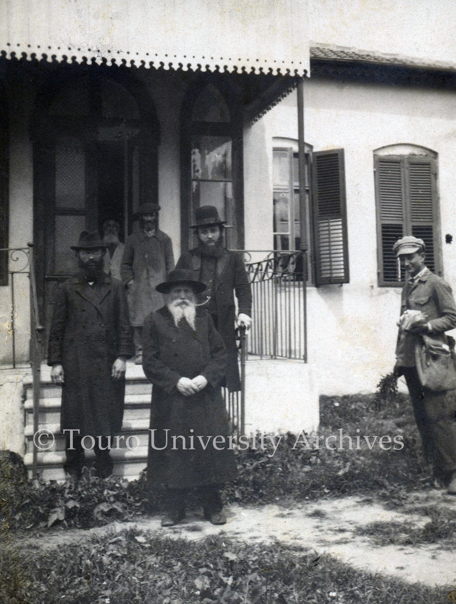A 1922 photograph of Pinkhes-Dov Goldenshteyn, standing in the foreground with his white beard parted in the middle. Standing on the first step is Rabbi Yisroel Aba Tsitron, the rabbi of Petakh-Tikva and the son-in-law of the Rogatshover Gaon.