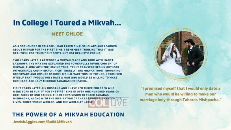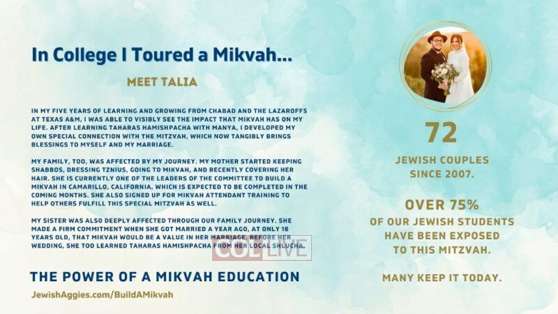 Talia relates about her Jewish journey, “In my five years of learning and growing from Chabad and the Lazaroffs at Texas A&M, I was able to visibly see the impact that mikvah has on my life. After learning Taharas Hamishpacha with Manya, I developed my own special connection with the mitzvah, which now tangibly brings blessings to myself and my marriage.”