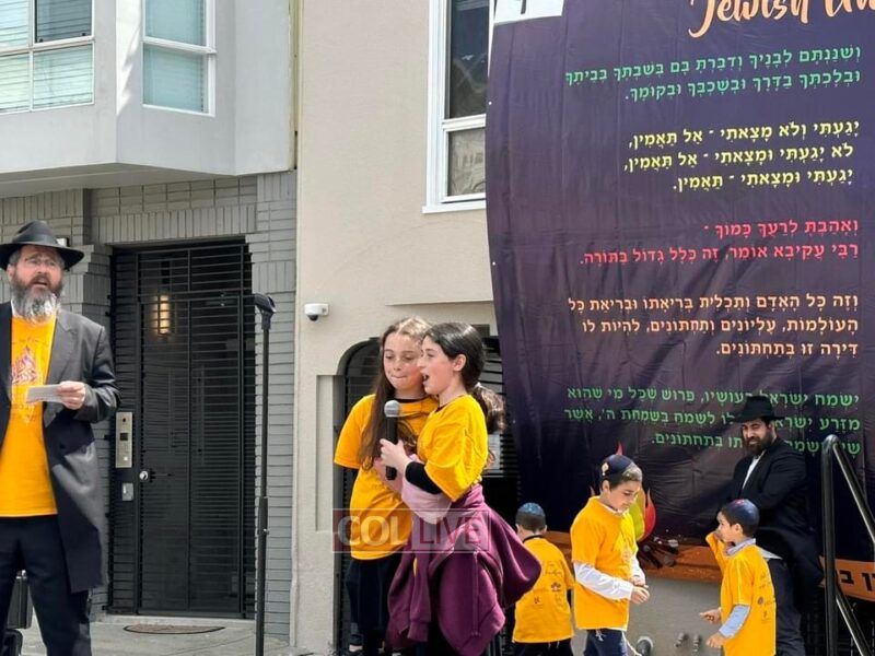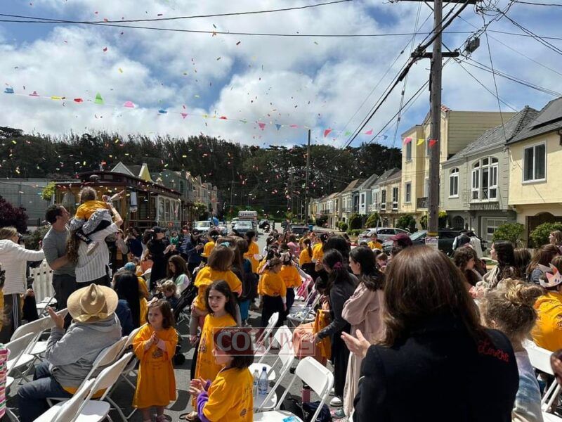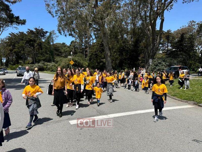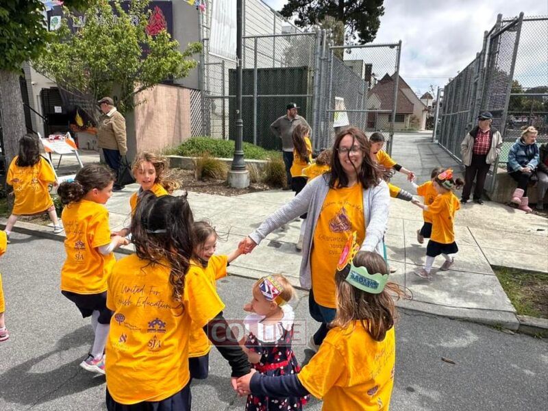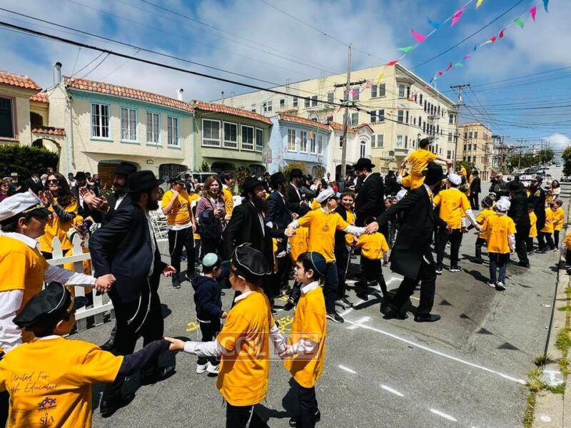 Next was a sight to behold! It wasn’t long before circles formed and hundreds of smiling Jewish children together with their parents and teachers started to sing and and dance flooding the street with such simcha and joy. Who could have imagined, history was being made with Jewish joy and pride now becoming such a natural phenomenon right here on the streets of S. Francisco? It feels like this is just the beginning of an exciting future for these “locally grown” children who will certainly continue to carry forth the torch of Judaism into the streets of Northern California until the arrival of Moshiach.
