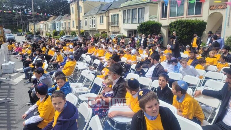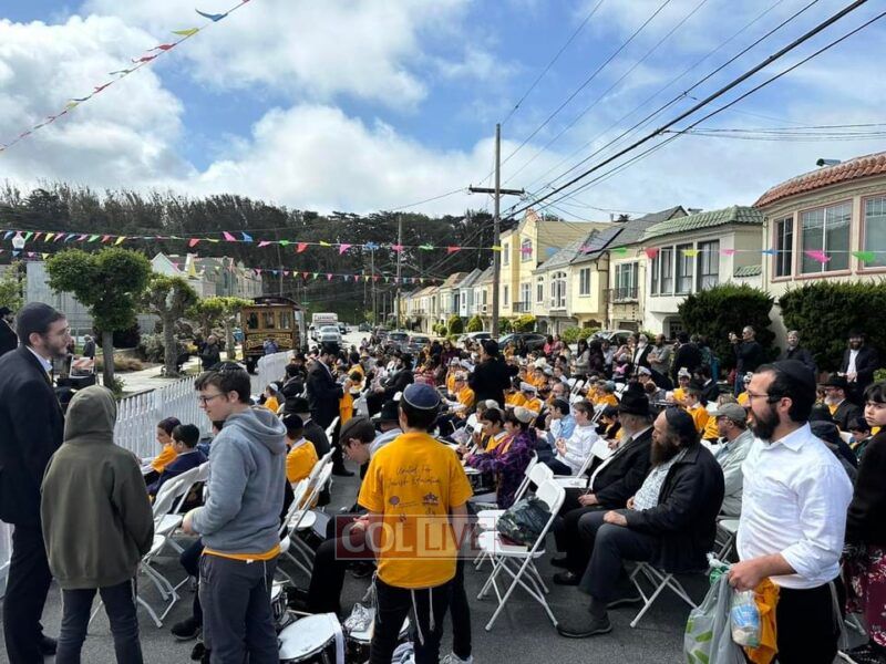 Close to 500 men, woman and children from as far north as Humboldt county, down to S. Cruz in the south, and Sacramento and Roseville in the east, came together to celebrate this sacred and joyous day in achdus and unity. The excitement was palpable as guests gathered in front of Bais Menchem in S. Francisco where the entire block of 28th Avenue was closed off in honor of the occasion. Huge banners, posters and flags adorned the street as police vehicles and officers mounted police on horses stood by. As the background music played and the crowd got bigger, so did the smiles on everyone’s faces.