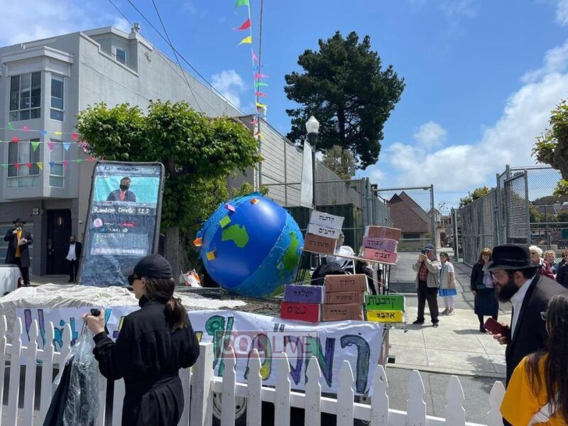 As everyone settled in their seats, the floats and parade began to roll. First was the mitzvah cable car followed by gorgeous floats. The theme was Hakhel and Sacramento Jewish Academy skillfully and artistically crafted a float with a globe depicting how through the study of Rambam, Jews from all over the world are united together.