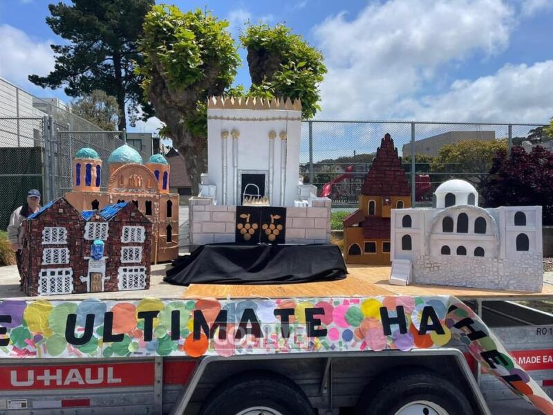 The next float, designed and created by the Pleasanton Cheder, was truly a masterpiece. It depicted the ultimate hakhel with Moshiach when all of the shuls will join together to be part of the third Beis Hamikdash!