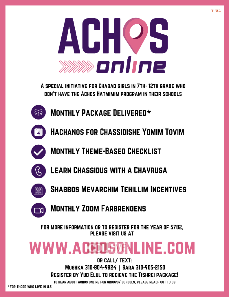 At Achos Online this year, we will be focusing on the joy and energy that Chassidus infuses into our daily life. During Tishrei, we will pack our boxes, and throughout the year, we will unpack the boosts of Chassidishe warmth that we have picked up, with monthly mailed packages, themed checklists, Zoom Farbrengens, Chavrusa learning, and incentives.