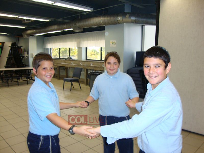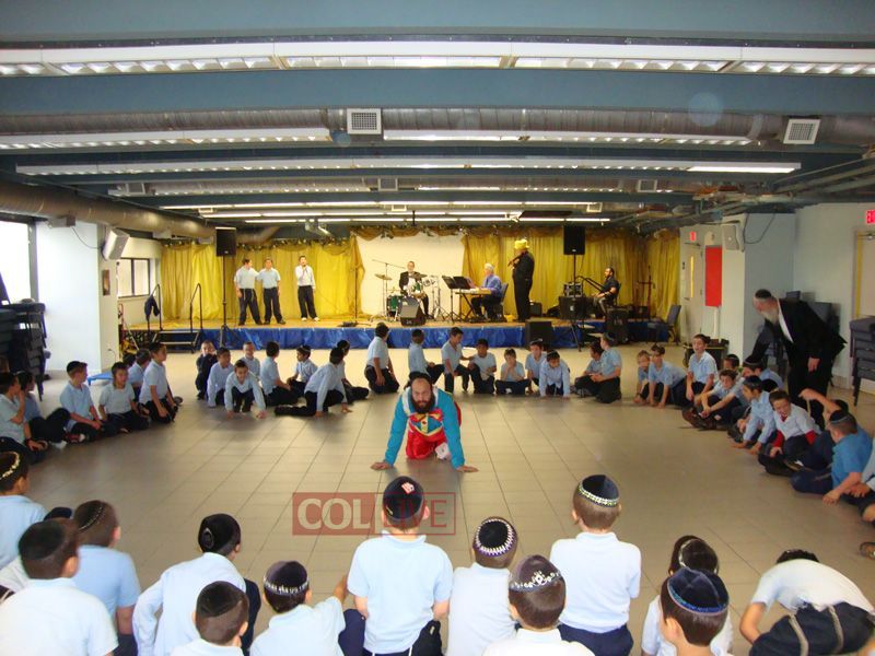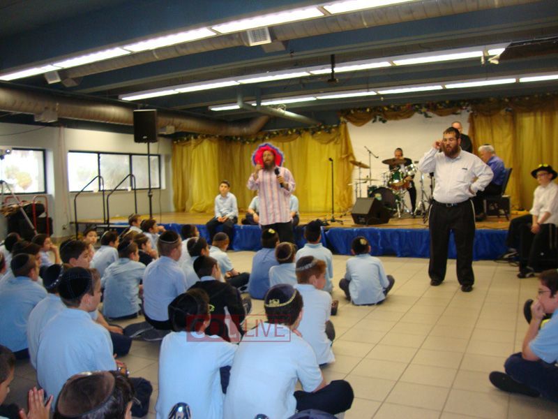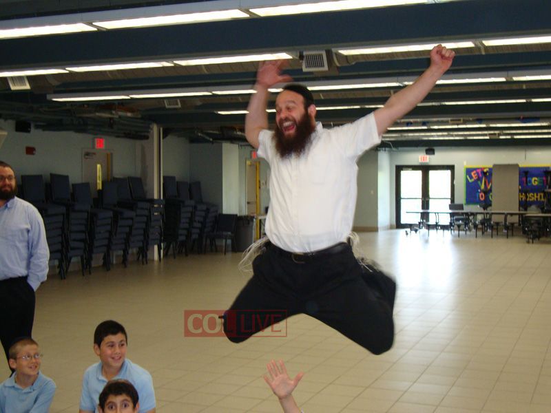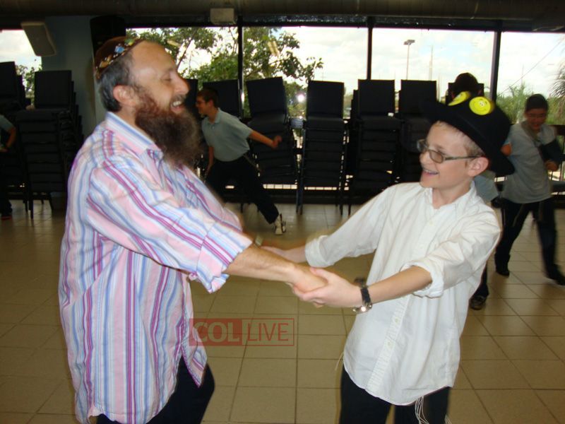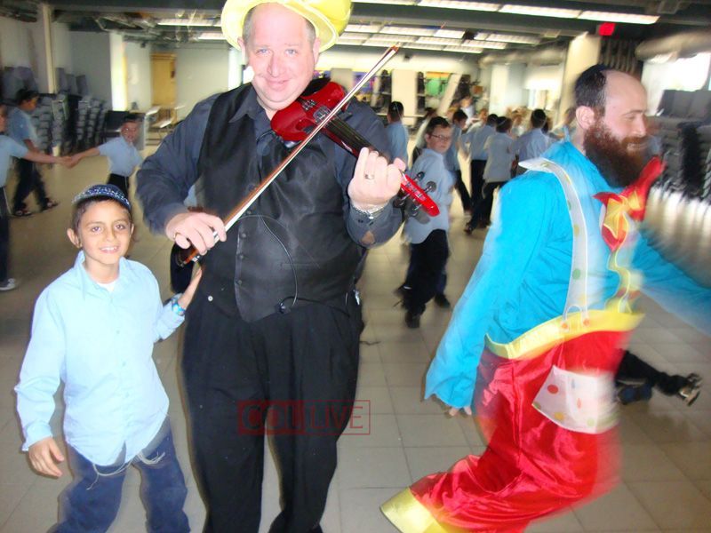 Students danced in huge circles, while teachers Rabbi Menachem Tauber and Rabbi Yossi Levy, dressed in clown costumes, had the students literally bouncing on their hands and feet!