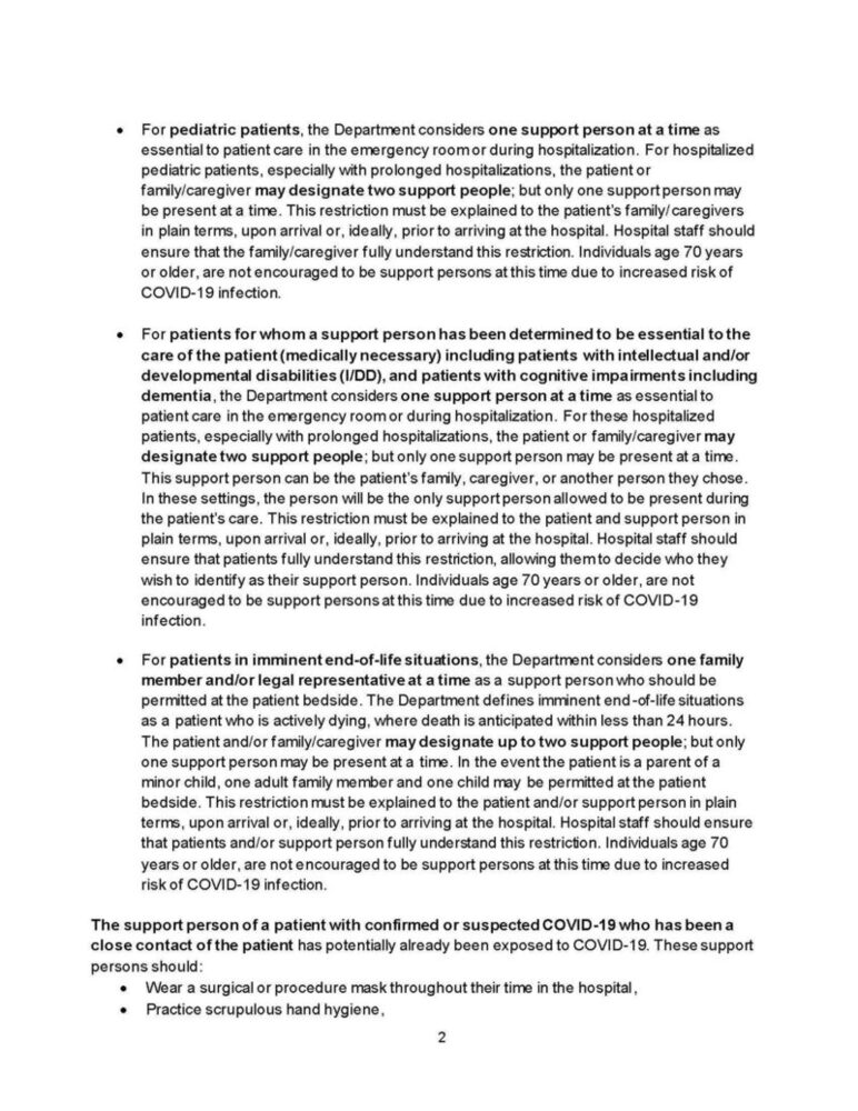 Under the new directive, hospitals are required to permit a patient support person at the patient bedside for patients in labor and delivery, pediatric patients, patients for whom a support person has been determined to be essential to the care of the patient (medically necessary) including patients with intellectual and/or developmental disabilities and patients with cognitive impairments including dementia.