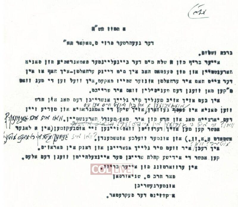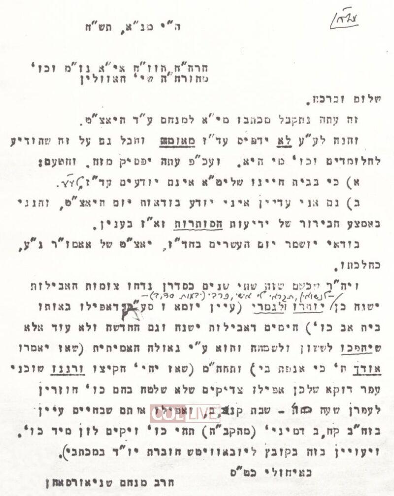 The third letter, dated 18 Av 5708, was sent to Rabbi Chanoch Hendel Havlin of Yerushalayim on Merkos stationary. In this letter — which is in continuation to correspondence in which the Rebbe asked that learning be held in Rebbetzin Sheina’s memory — the Rebbe tells him not to publish anything about Rebbetzin Sheina nor to tell any of the learners about her identity, to ensure that the information would not reach the Frierdiker Rebbe. The Rebbe notes that “I am not sure about the date of her passing, and I am in middle of investigating contradictory information in this regard.”