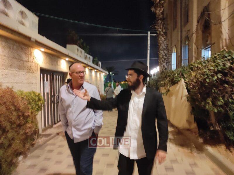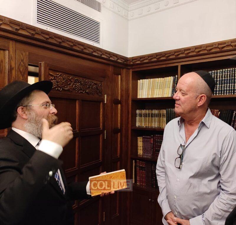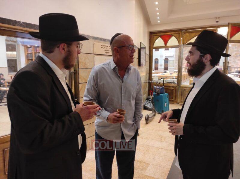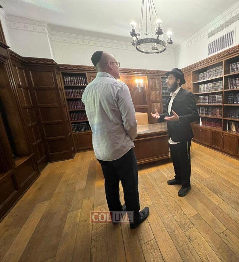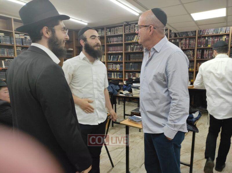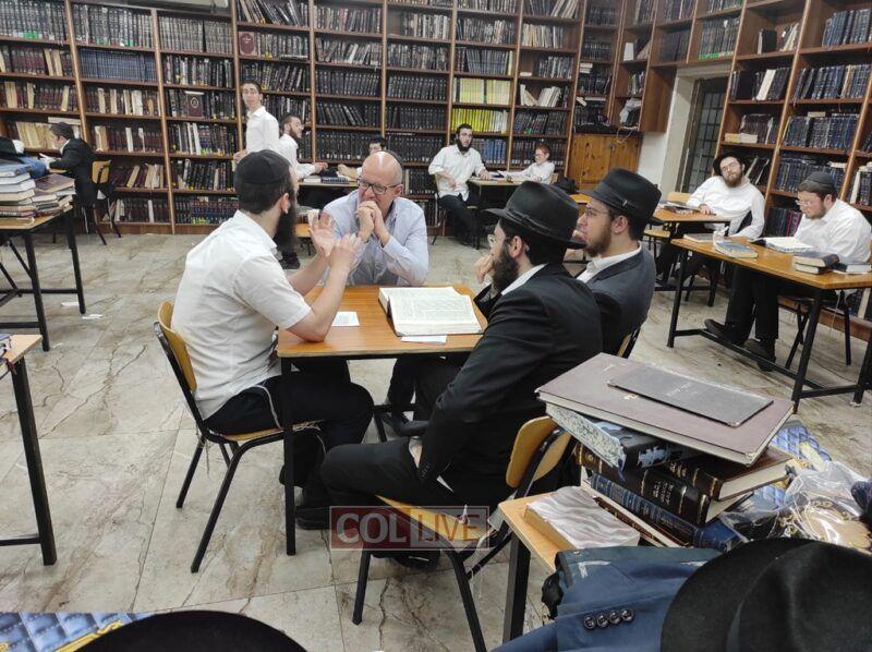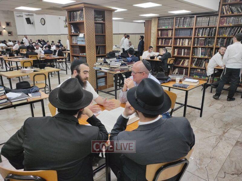 During the late-hour visit to the Central Yeshiva Tomchei Tmimim of Kfar Chabad, the ambassador found the zal study hall humming with Torah study. He joined one of the chavrusas and studied with Shamai Chein, a student of the yeshiva.