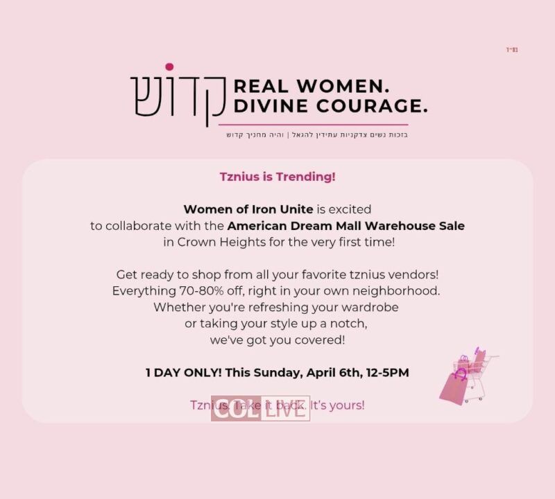 This is a unique opportunity to purchase top quality tznius clothing at tremendous discounts just in time for Yom Tov. You don’t want to miss it. Join us this Sunday at Bais Rivkah from 12-5pm. We look forward to seeing you there!