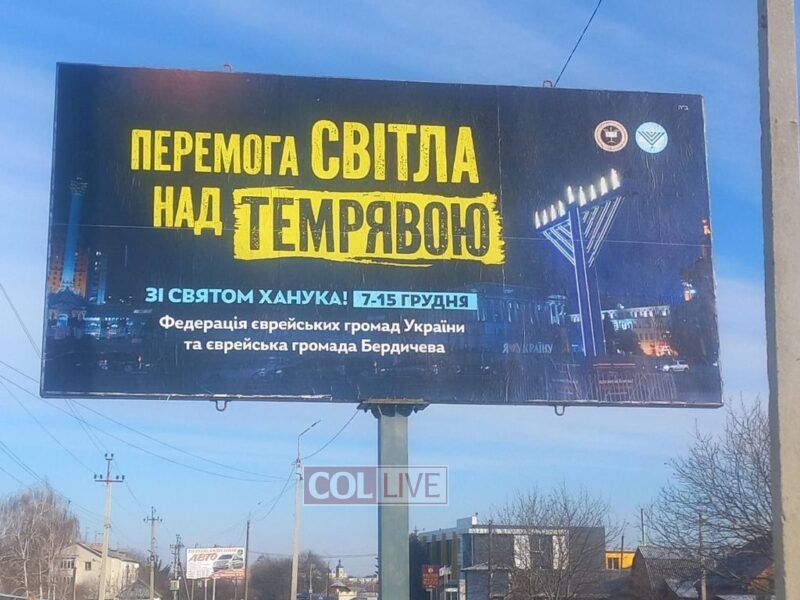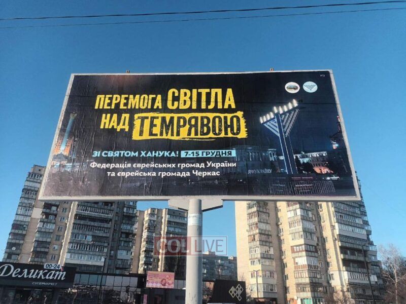 Throughout Ukraine, 1,200 huge billboards in 82 cities were put up by the FJCU, inviting people to celebrate Chanukah and help to light up these dark days. It was estimated that over 10 million residents in Ukraine were exposed to the Chanukah messages from these signs.