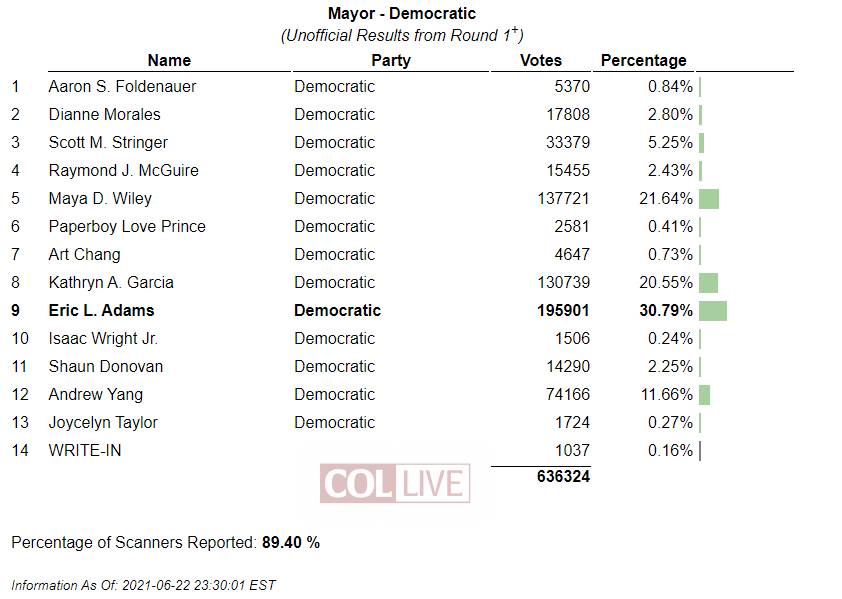 Brooklyn Borough President Eric Adams was leading in early returns, with Maya Wiley and Kathryn Garcia behind him. Curtis Sliwa won the G.O.P. primary.