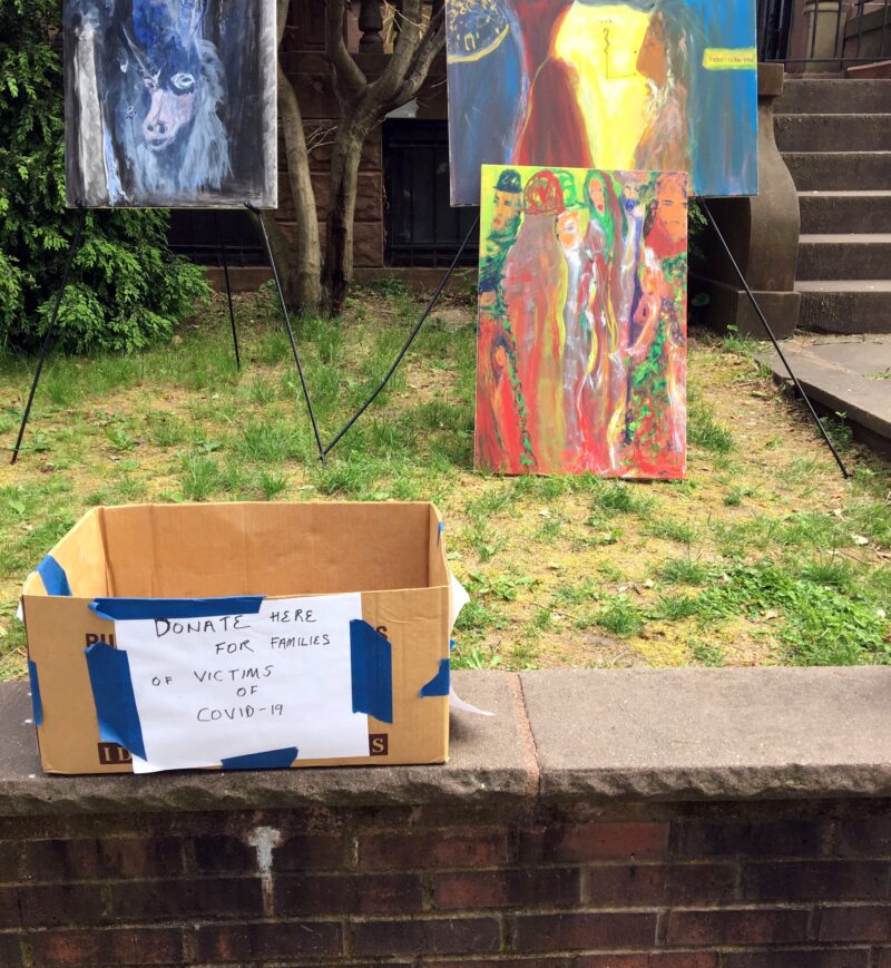 Instead, he created the “Free Walk-by Art Exhibition” outside his home on Carroll Street where he has been exhibiting selections of his lively paintings. He started a few weeks ago and has been receiving an enthusiastic response.