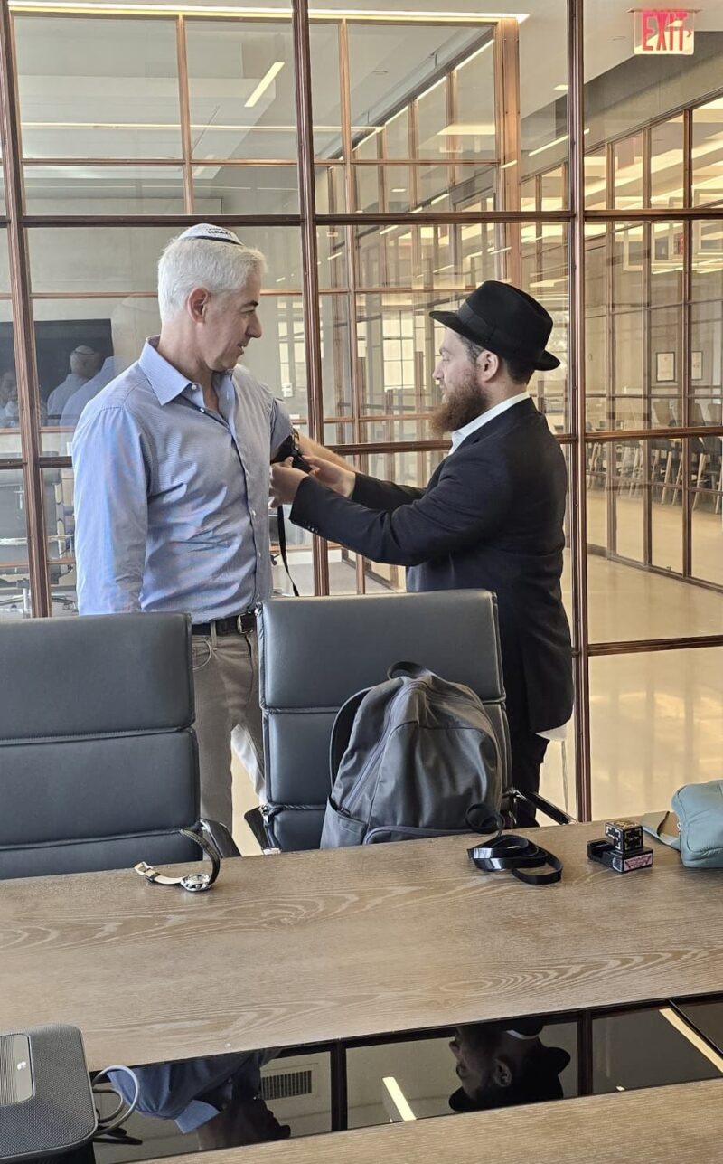 Standing alongside him was Yossi Farro, a Chabad bochur who is relentless about putting on Tefillin with fellow Jewish men—especially notable ones.