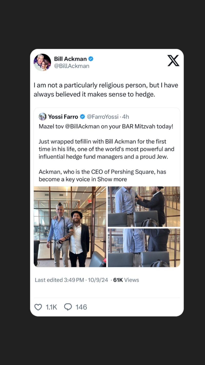 “Mazel tov @BillAckman on your BAR Mitzvah today!” Farro tweeted. “Just wrapped tefillin with Bill Ackman for the first time in his life, one of the world’s most powerful and influential hedge fund managers and a proud Jew.”