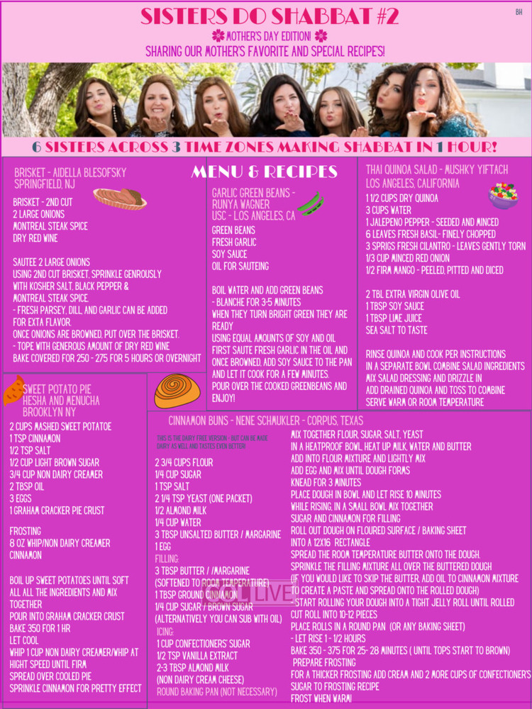 The 6 Avtzon sisters from 3 time zones joined again this week to open their kitchens to their communities doing a second edition of “Sister Do Shabbat” where they cook and provide tips to their communities.