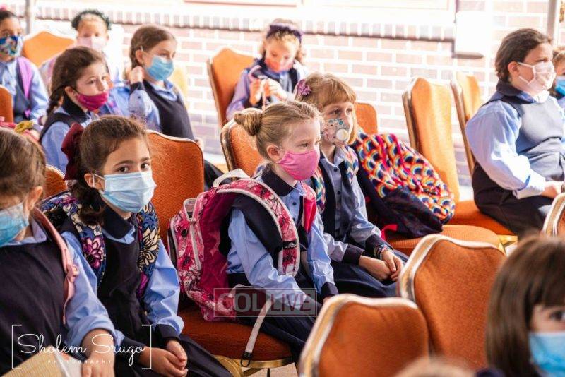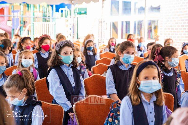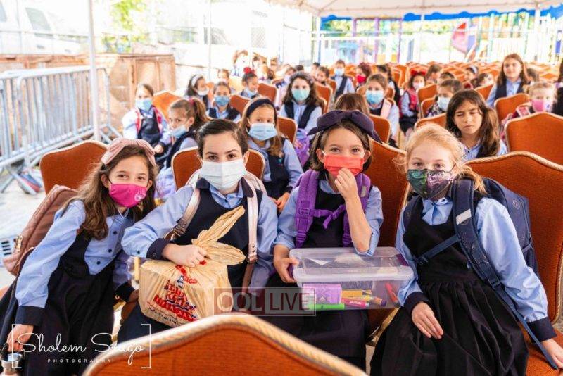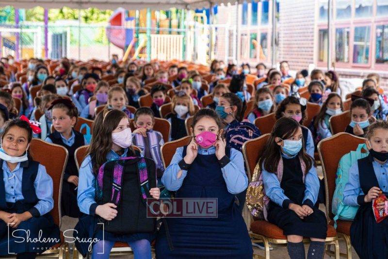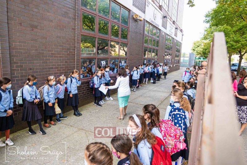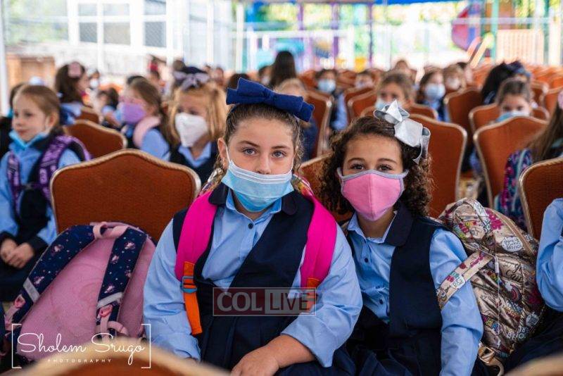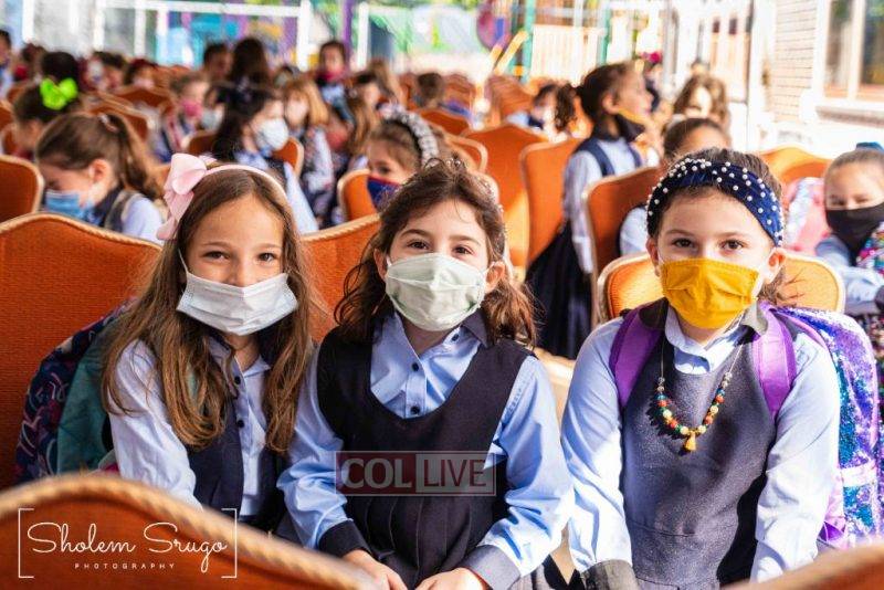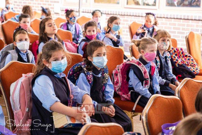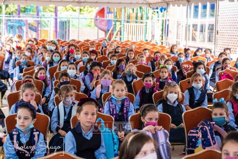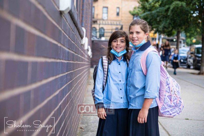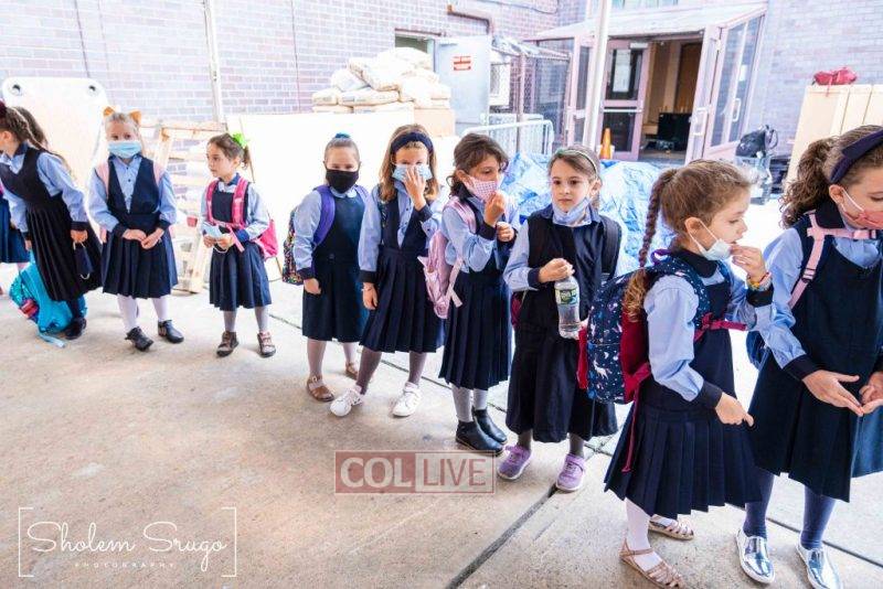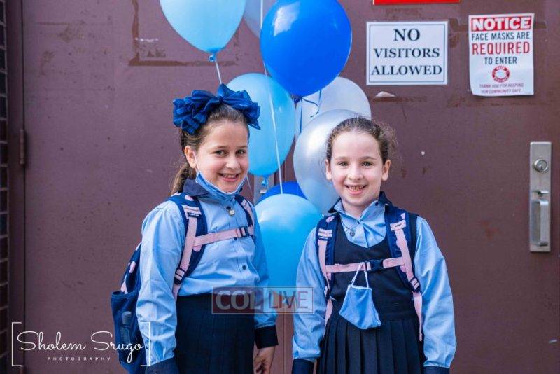Wearing uniforms, bows and masks, students were happy to resume in-person learning with the start of the new school year at Bais Rivkah of Crown Heights on Tuesday. Photos