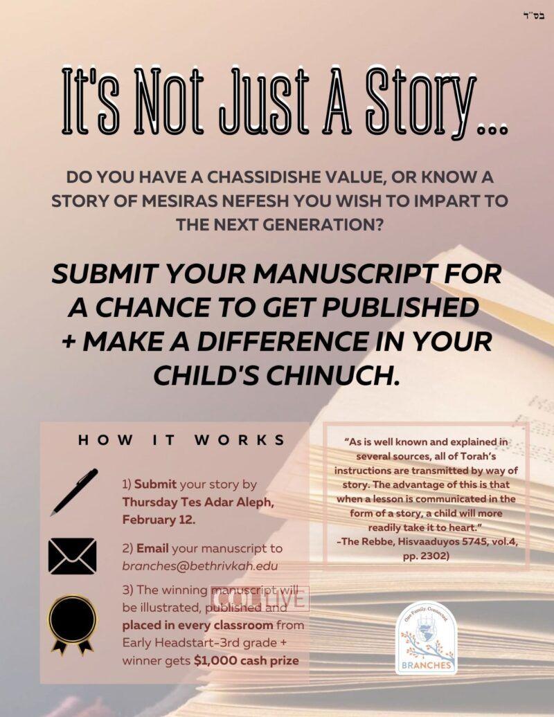 The winning manuscript will be illustrated, published and placed into Bais Rivkah classrooms. The winning author receives $1,000 cash prize.