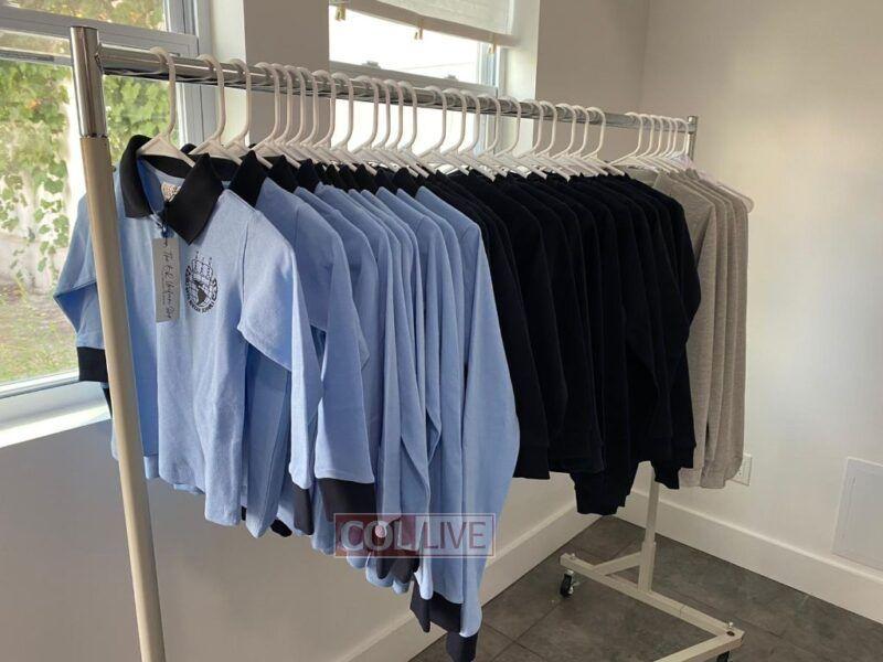 Long-sleeve polos (offered in two-toned blue for elementary students and in gray for high school students) ($17.95), v-neck sweaters ($26.95), collars ($11.95), and backpacks ($5-$8) will be available for purchase, as well as a cable knit sweater ($30) available for pre-order at the shop or on the shop’s website, TheBRUniformShop.com.