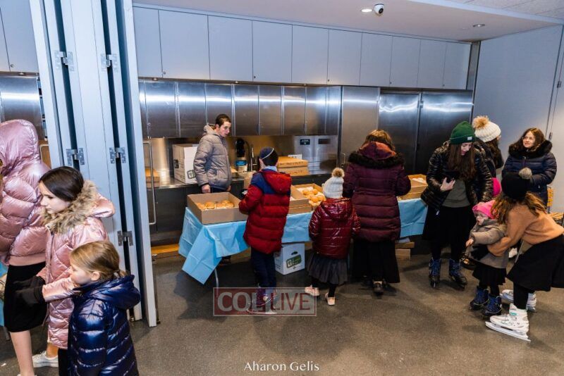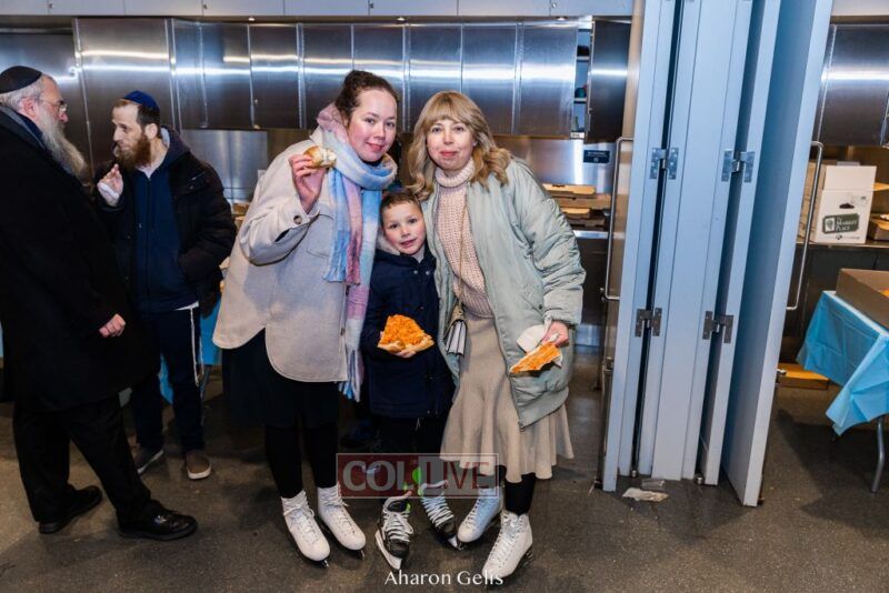The crowd proudly celebrated Chanukah in the public park, enjoying hot latkes, doughnuts and pizza and family ice skating to Jewish music at the Le Frak rink.
