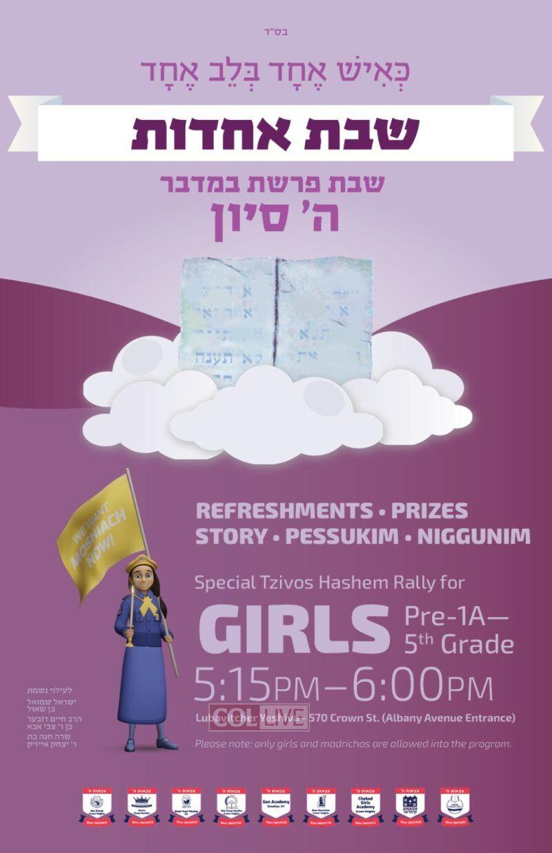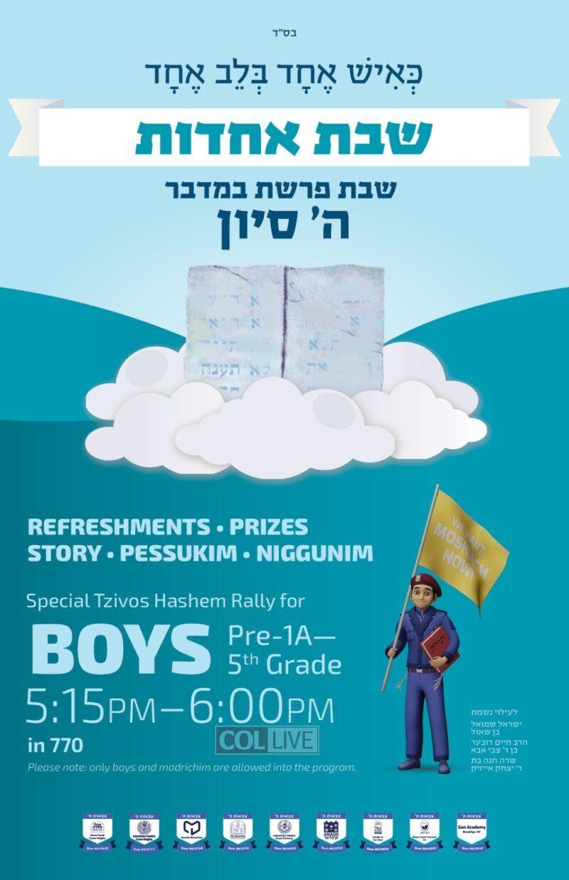 The Rebbe requested, as a Bakosha Nafshis, that Jewish children, the guarantors for Torah, gather together on the Shabbos before Mattan Torah. This mirrors the unity our people displayed, as they stood at Har Sinai, “K’ish echod, b’lev echod,” as one man, with one heart.