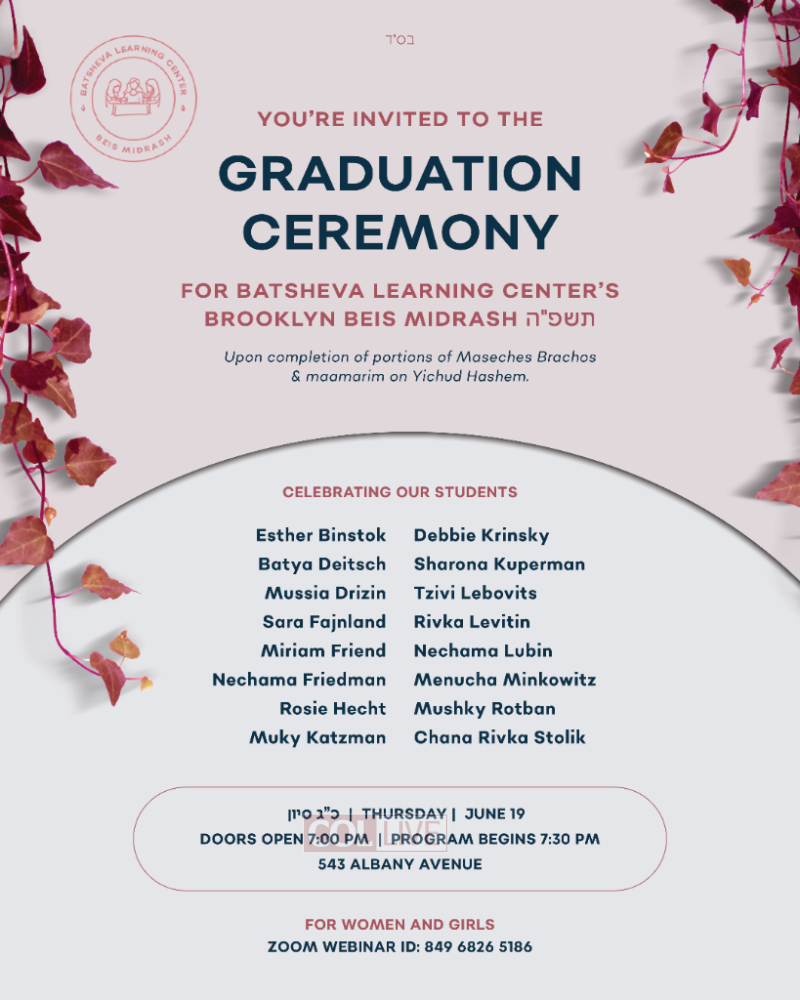 This isn’t just a celebration of what they’ve accomplished—it’s a celebration of what’s possible when Torah learning is taken into your own hands. This is why you are invited to celebrate with these young women on Thursday, 23 Sivan, June 19th, at 543 Albany Ave at 7:30 PM.