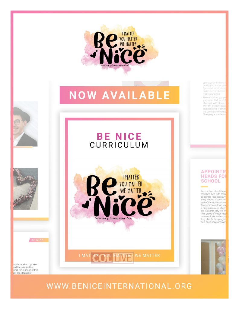 The Be Nice program was launched last year by Bnos Menachem High School principal Mrs. Rivka Karnowsky in the memory of her son Shmuel Karnowsky A”H. Shmuel was an excellent Talmid; a confident, intelligent yeshiva bochur who was especially known for his middos tovos. He was often heard telling others “Hey, be nice!”; and with these two simple words Shmuel infused so many situations with his innate positivity and genuine kindness. So with his simple yet profound words, the “Be Nice” program was started.