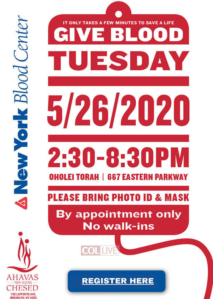 The demand for red blood cells is increasing due to area hospitals resuming elective surgeries. To help meet this demand, Ahavas Chesed will be sponsoring an appointment-only blood drive at the Oholei Torah Ballroom.