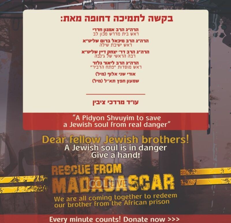 As part of the campaign, audio recordings of the Israeli citizen from Madagascar were presented in which he pleaded: “I am the only Jew here. I am afraid. I am going through a nightmare. Please save me. In the morning I say, ‘When will the night come?’ At night I say, ‘When will the morning come?’ There are 800 inmates with me, all dangerous criminals and antisemites who could kill me at any moment. I am the only Jew here. I am in constant fear in a corner. They took my clothes. I don’t have tefillin. I have nothing to eat. I can’t survive this.”