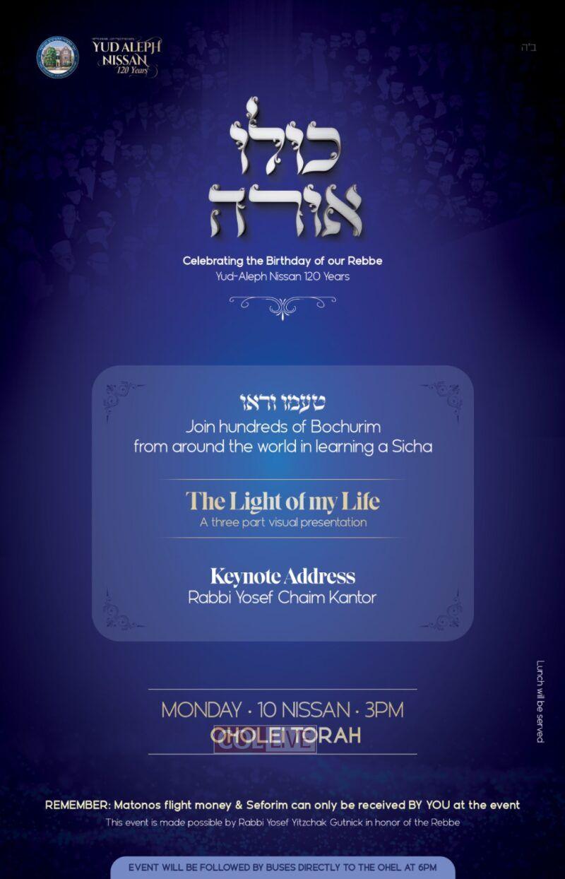 The event titled ‘Kulo Orah’ will feature a three-part video presentation on Hiskashrus, encouraging bochrim to strengthen their connection through living with the Rebbe, the Rebbe’s Torah and Horaos.
