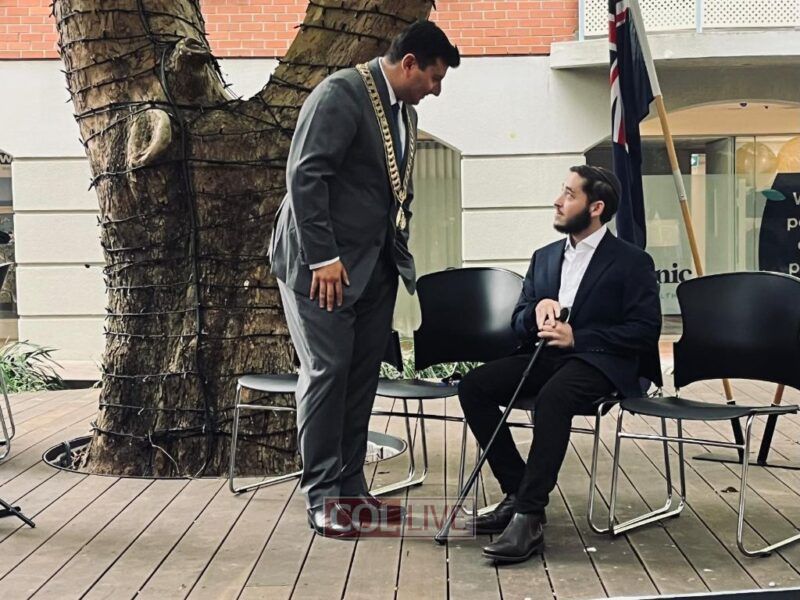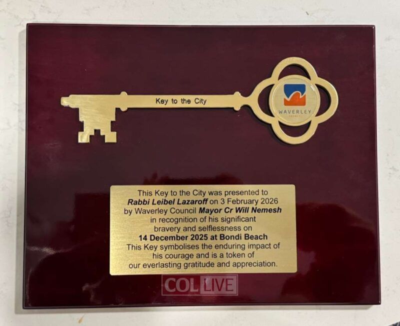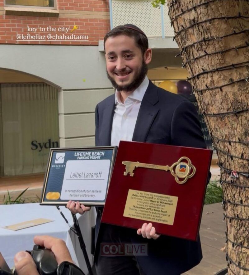 Leibel, the 20-year-old son of Shluchim Rabbi Yossi and Manya Lazaroff, Directors of Chabad at Texas A & M University, has been awarded the highest civic honor by Sydney’s Waverley Council. Waverly Council Mayor Will Nemesh presented him with a symbolic “Key to the City” on Tuesday, in recognition of his heroism, symbolizing “the enduring impact of his courage.”