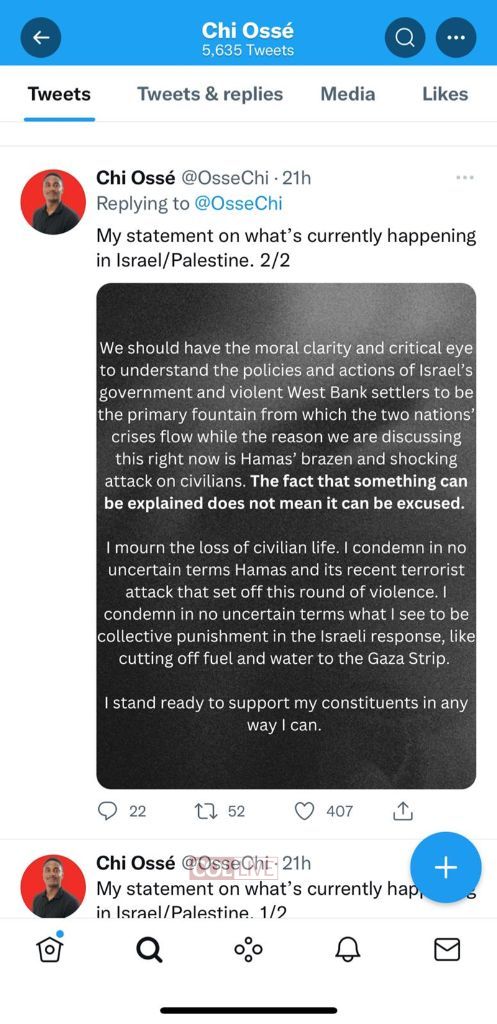 Osse wrote on X (Twitter) what appears to be criticism of Israel’s relationship with the Palestinians in Gaza and their response to the horrific and inhumane attacks on innocent civilians in Israel: